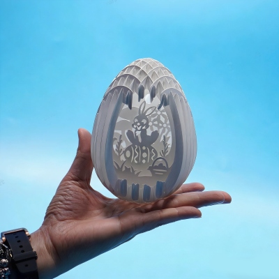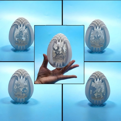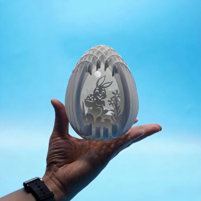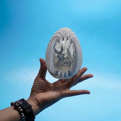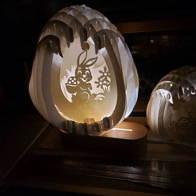 Encantador diseño 3D cortado con láser : esta mágica lámpara de huevo de Pascua presenta una delicada silueta hueca de conejitos, flores y huevos, intrincadamente tallados en una estructura en capas que crea una profundidad impresionante al encenderse. El cálido resplandor interior proyecta sombras suaves, convirtiendo cada pieza en una brillante obra de arte, perfecta para la hora de dormir o como decoración navideña.