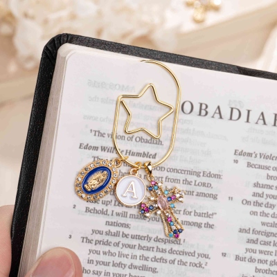 Diseño con símbolos sagrados : este elegante marcapáginas presenta un clip dorado adornado con significativos símbolos religiosos, como un detallado medallón de Nuestra Señora de Guadalupe, una cruz brillante y un colgante con inicial personalizada. Cada pieza está elaborada para reflejar fe y devoción.