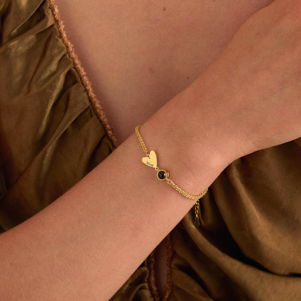 Elegante diseño de corazón : Esta pulsera cuenta con un delicado dije en forma de corazón y una piedra miniatura para proyectar fotos. Su estilo delicado y atemporal añade un toque sutil a cualquier look.