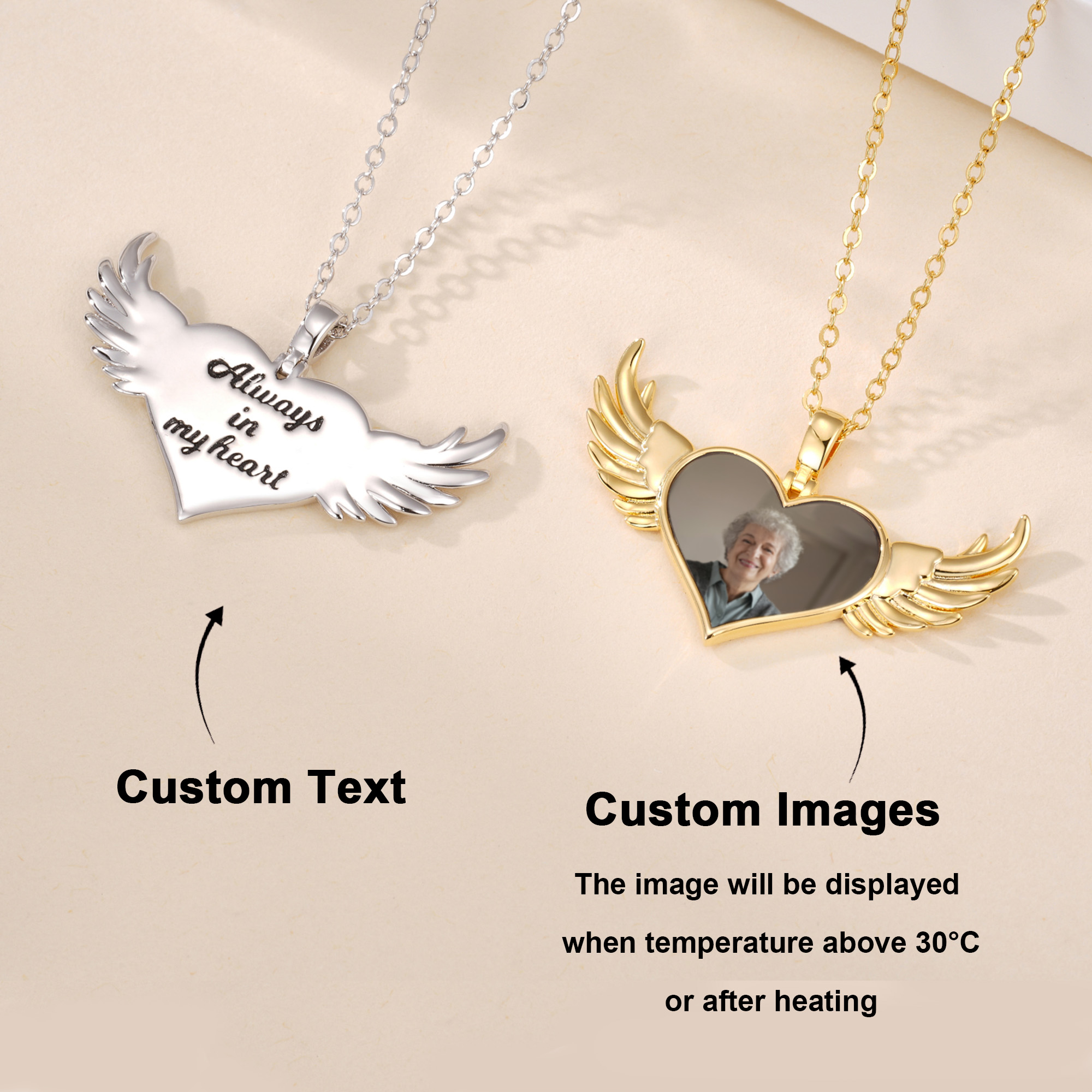 | Estilo | Collar de alas de ángel con foto oculta, grabado personalizado y activado por calor |