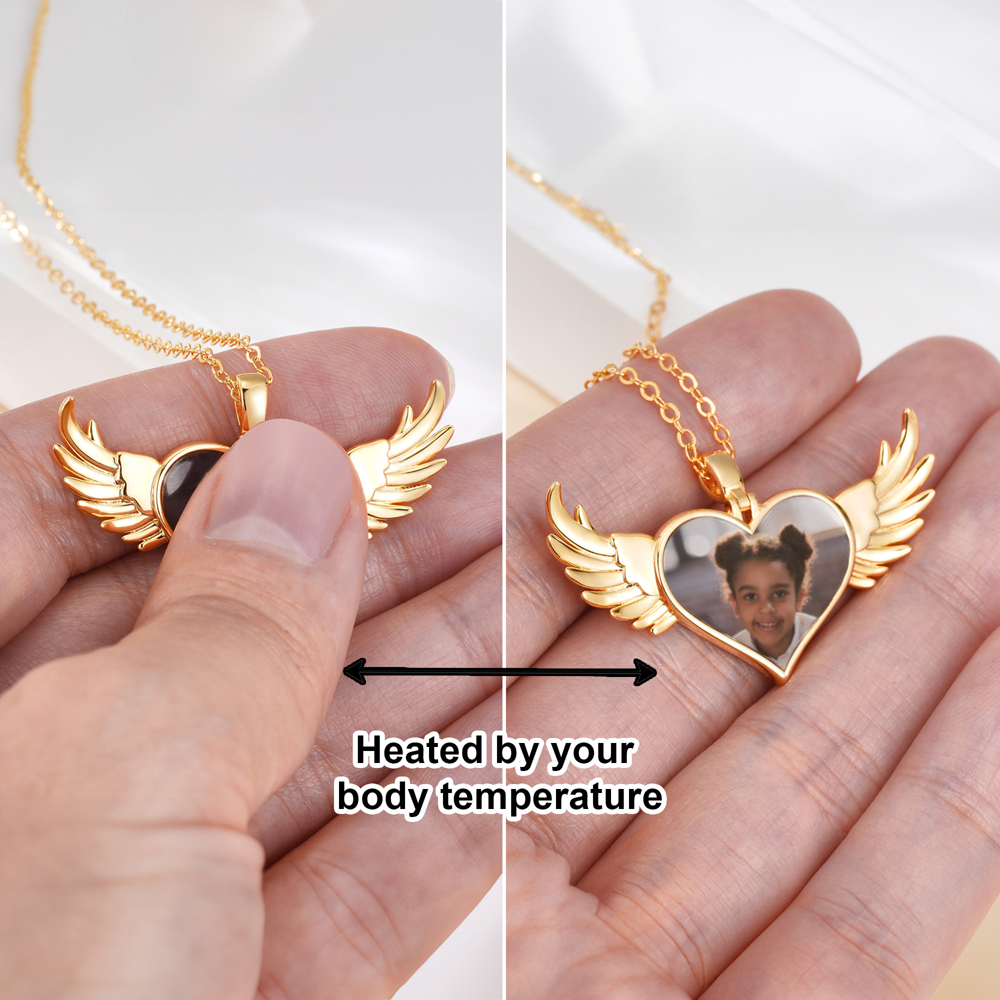 Diseño de Corazón con Alas de Ángel : El colgante muestra un corazón envuelto en alas de ángel, símbolo de amor, protección y recuerdo. En su interior, una foto oculta sorprende sutilmente, revelando una imagen preciada con una temperatura superior a 30 °C/86 °F, aportando un toque emotivo y significativo.