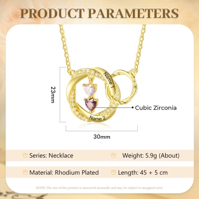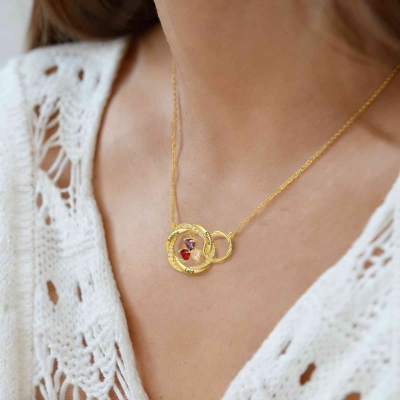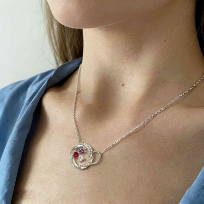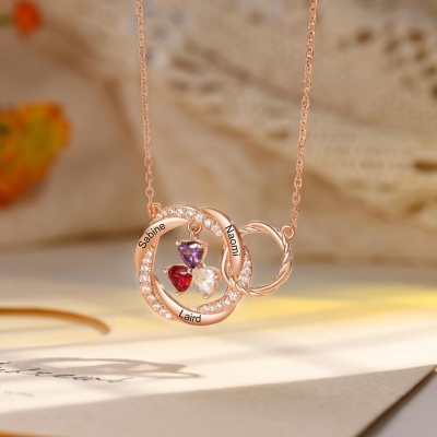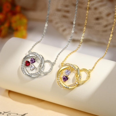 Personalización : Se graban delicadamente hasta seis nombres en los bordes exteriores de los círculos, cada uno acompañado de una piedra natal en forma de corazón que cuelga en el centro. Las piedras están engastadas de forma segura y brillan suavemente con el movimiento, convirtiendo los cumpleaños de tus seres queridos en un homenaje que puedes llevar contigo a diario.