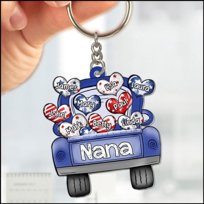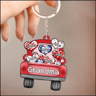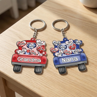 Personaliza con nombres y títulos : Agrega los nombres de entre 1 y 9 nietos o hijos en corazones de colores y personaliza la caja de la camioneta con "Abuela", "Nana" o cualquier otro título. Cada nombre se muestra claramente para darle un toque especial.