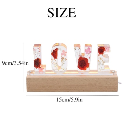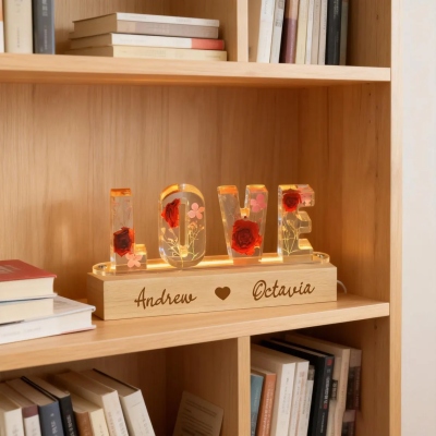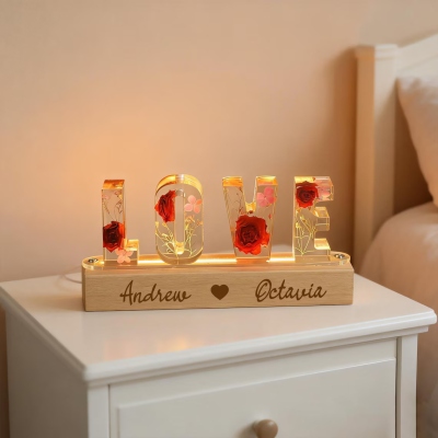 Lámpara de noche LED LOVE Rose : Esta elegante lámpara de noche presenta la palabra "LOVE" en letras de resina luminosas, cada una adornada con rosas secas y delicadas flores. La base de madera lleva impresos dos nombres y un símbolo de corazón, convirtiéndola en un recuerdo entrañable para cualquier pareja.