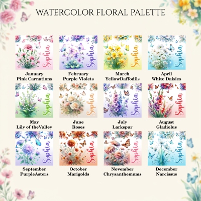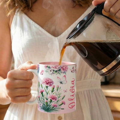 Delicada artesanía : cada taza presenta un ramo de flores del mes de nacimiento ilustrado a mano, decorado con mariposas de acuarela revoloteando en tonos translúcidos; el diseño botánico se extiende por la cerámica con suaves degradados y detalles de líneas finas, creando una sensación de calma primaveral y significado personal.