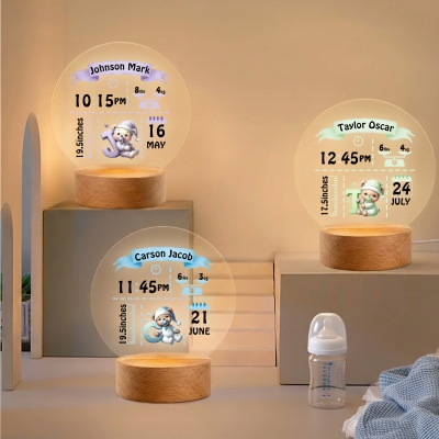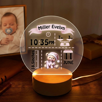 Adorable diseño de oso : Esta luz de noche presenta una tierna ilustración de un oso, junto con las estadísticas del nacimiento del bebé y un nombre. Su delicado diseño resalta detalles importantes como la fecha de nacimiento, la hora, el peso y la altura, convirtiendo un momento especial en un recuerdo imborrable. La divertida temática del oso y el alfabeto se adapta a la perfección a habitaciones infantiles y a sesiones de fotos de recién nacidos.