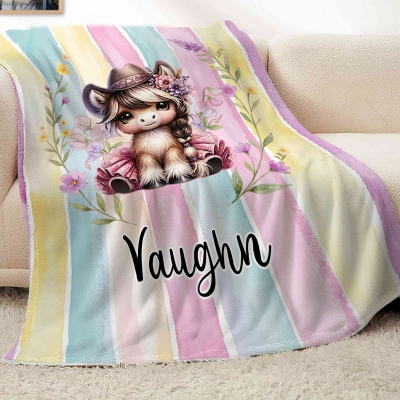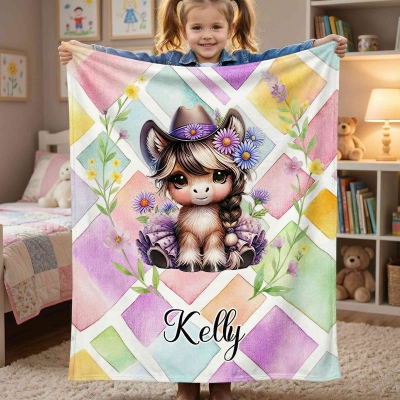 Diseño divertido y personalizado : esta manta, con una adorable vaquera a caballo de dibujos animados, está decorada con una flor de nacimiento personalizada y un nombre a medida para un look divertido y encantador. Su diseño lúdico combina el estilo rústico con un toque personal, creando una manta acogedora, cálida y con personalidad propia.