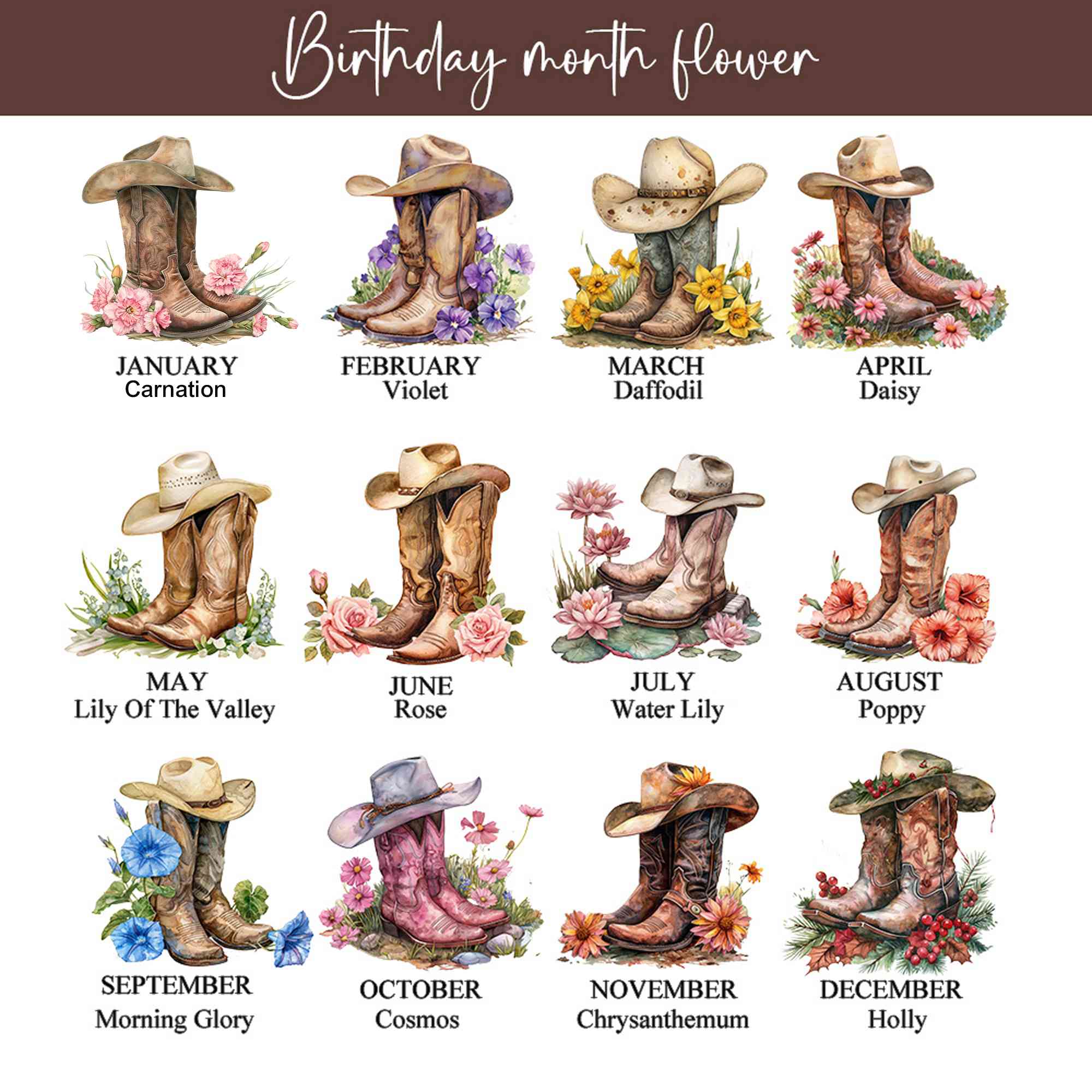 | Estilo | Bolsa de lona con diseño de sombrero y botas de vaquera con nombre personalizado y flor de nacimiento |