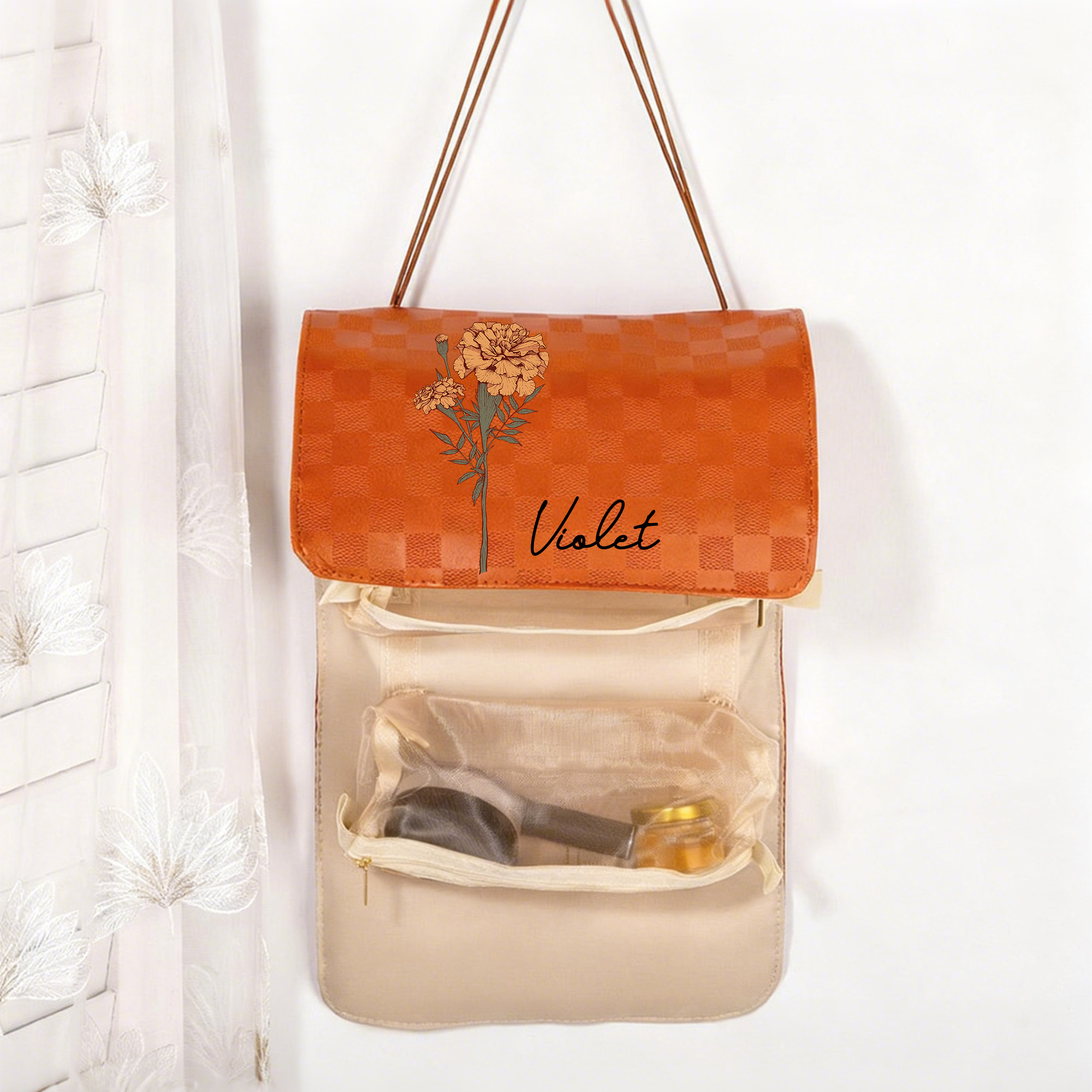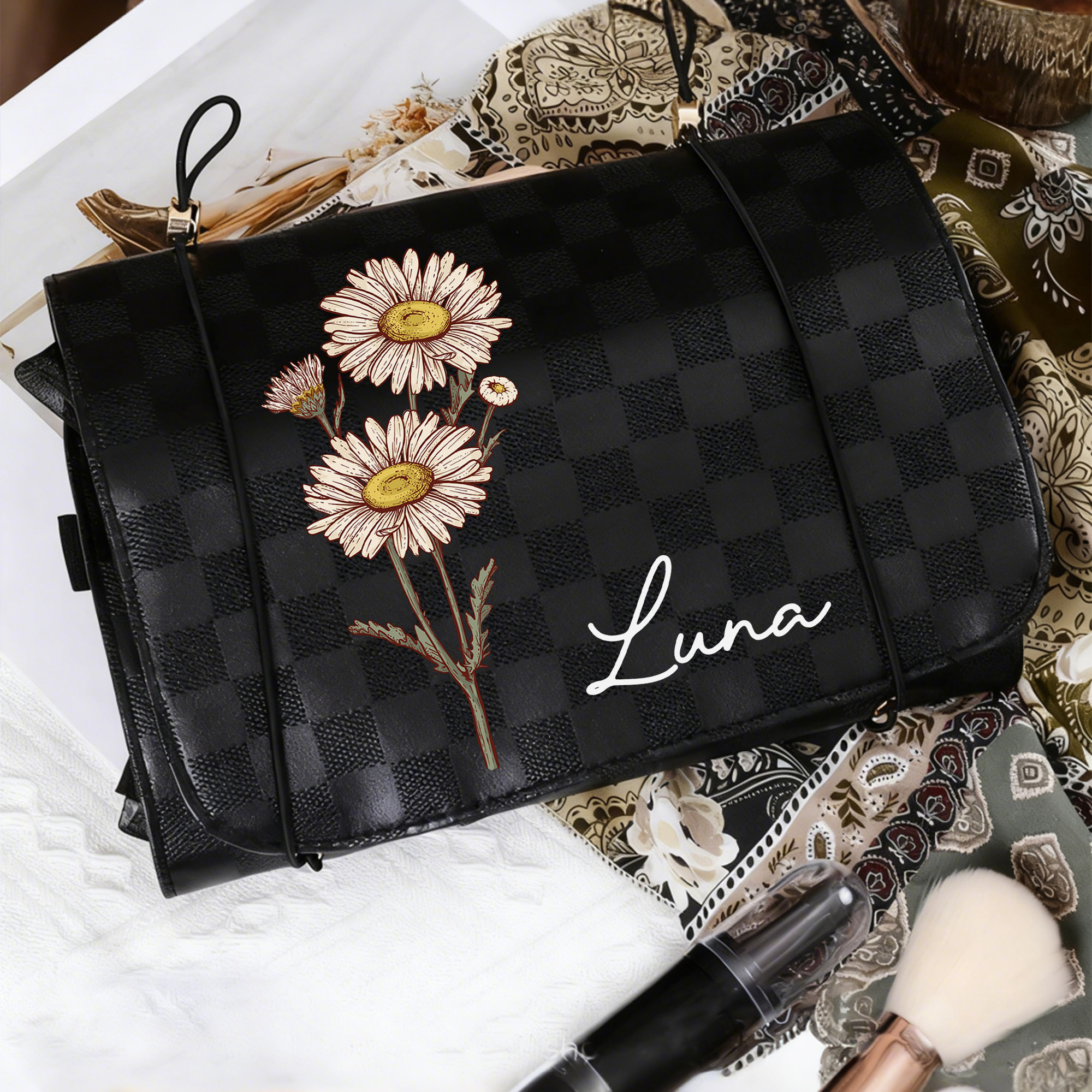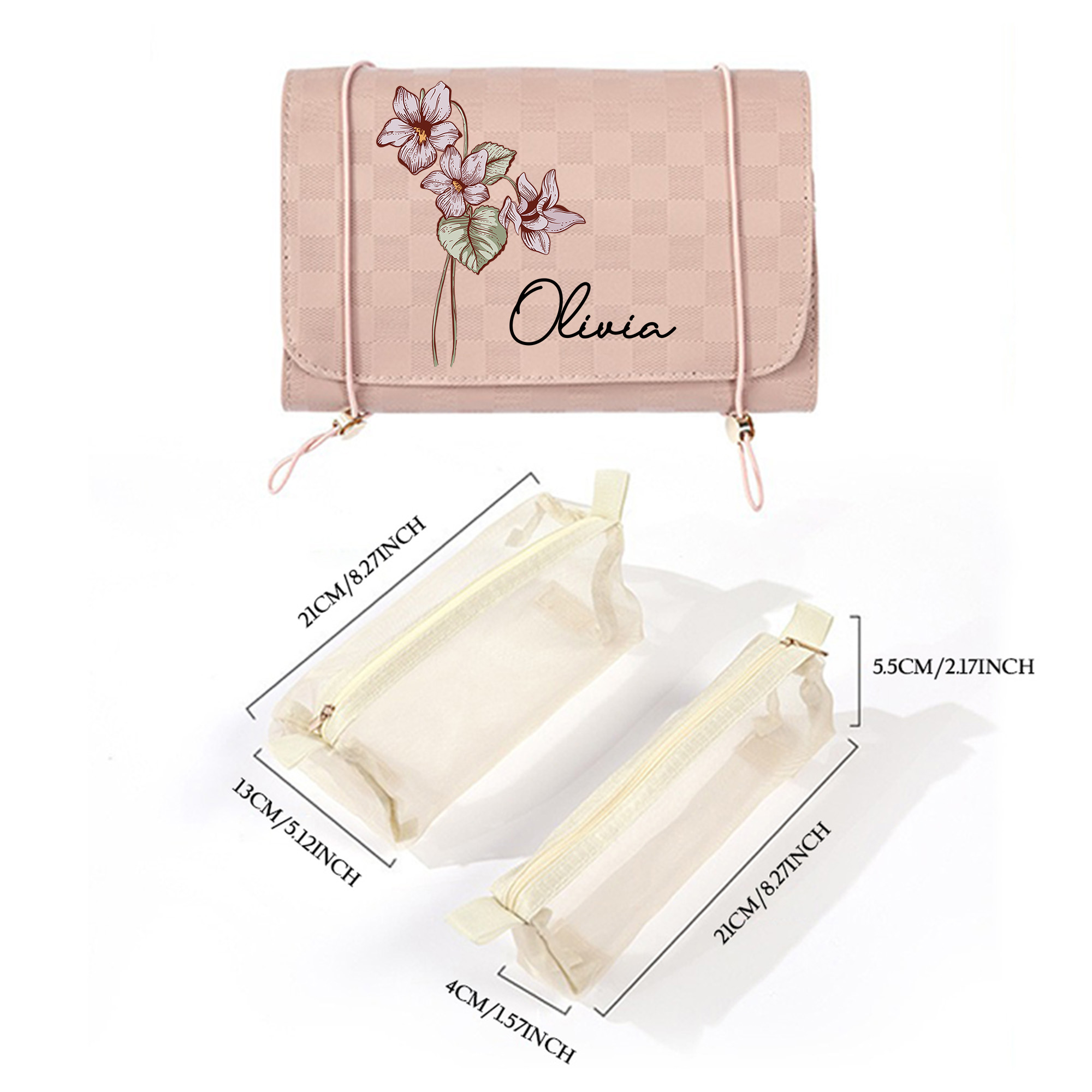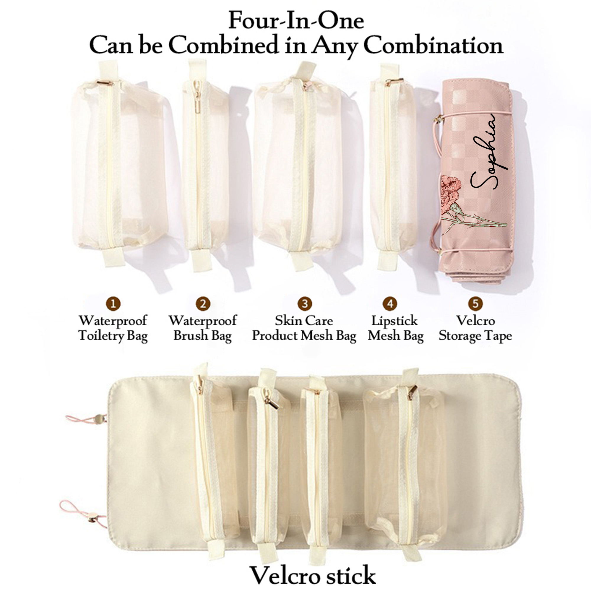 | Estilo | Neceser plegable 4 en 1 personalizado con nombre y flor de nacimiento |