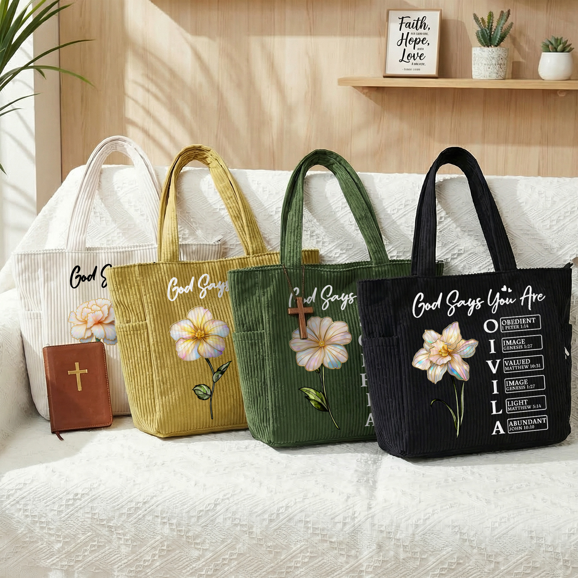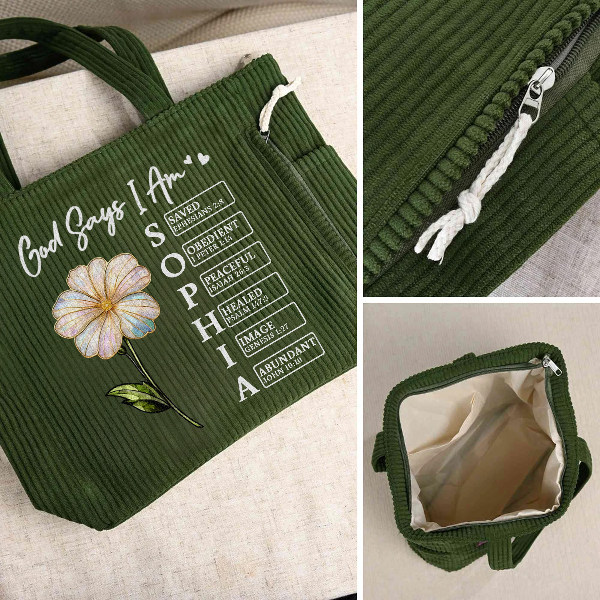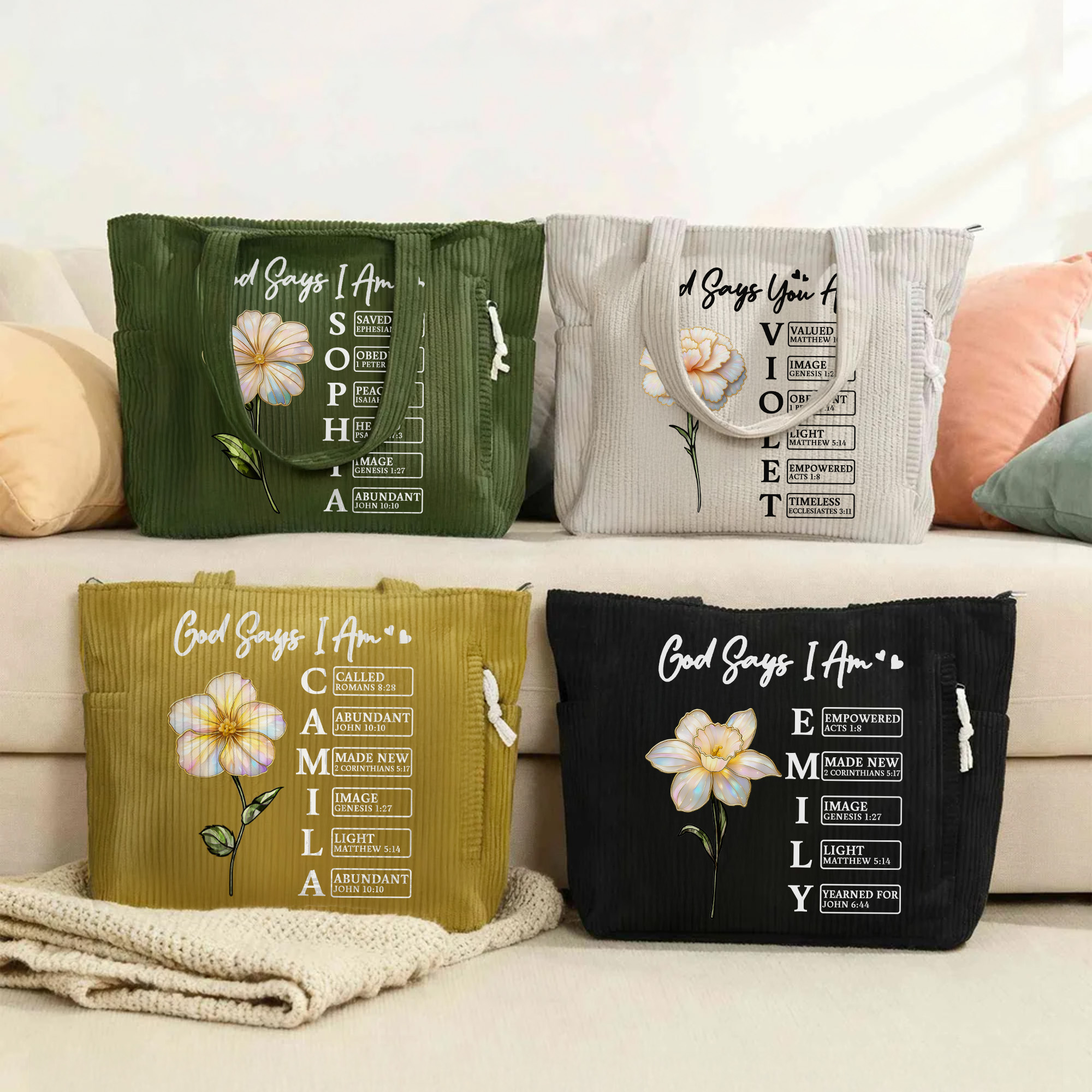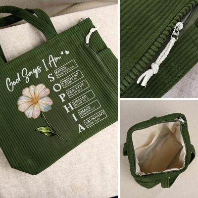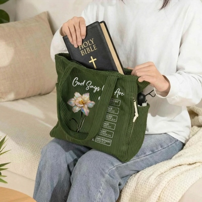 Diseño floral inspirado en la fe : este bolso de pana presenta una hermosa combinación de flores de nacimiento con efecto perlado y versículos bíblicos inspiradores de "Dios dice que yo soy/Dios dice que tú eres", creando un diseño significativo y elegante.