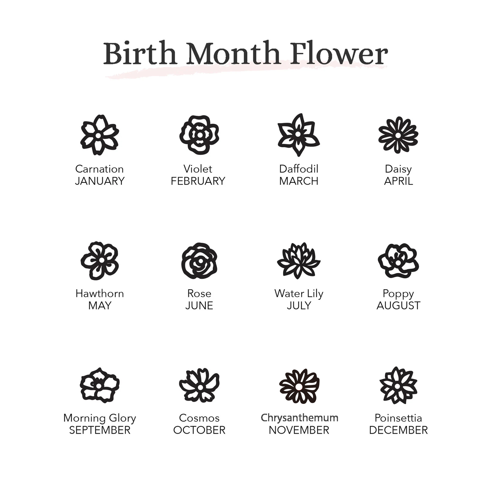 | Tamaño del colgante | Altura de la inicial del nombre: 0,9 cm (3,5 pulgadas); Altura de la flor de nacimiento: 1,3 cm (0,5 pulgadas) |
