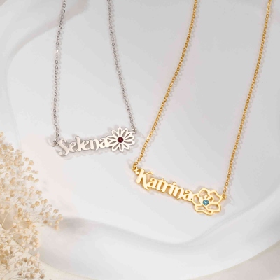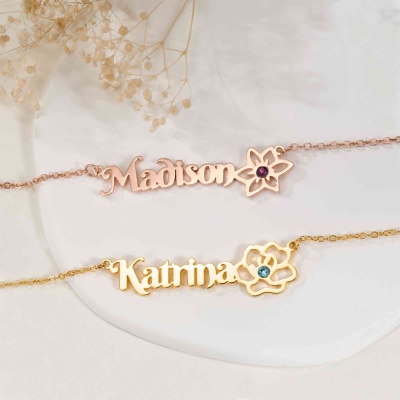 Un toque personalizado : personaliza el collar con cualquier nombre, flor y piedra natal para crear un recuerdo único. Cada detalle, desde la elegante tipografía hasta la brillante gema, refleja la historia personal de quien lo lleva, convirtiéndolo en una pieza exclusiva, creada especialmente para ella.