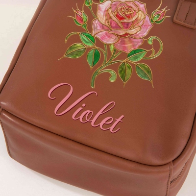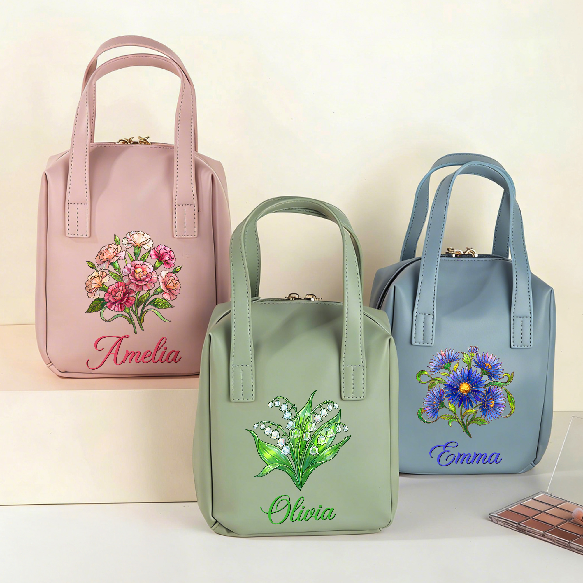 | Estilo | Neceser de viaje personalizado con nombre y flor de nacimiento, con asas. |