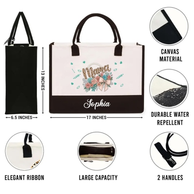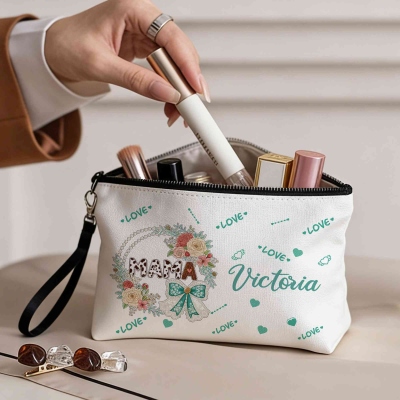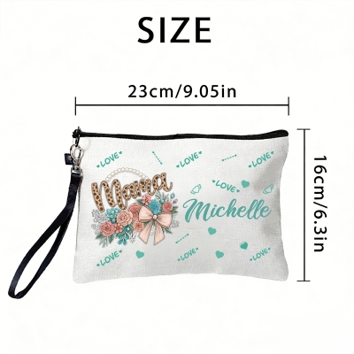 | Estilo | Bolso de mano y neceser de maquillaje con diseño personalizado de lazo floral y nombre "Mama" |