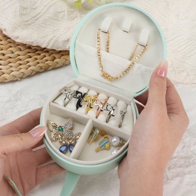Piel sintética de primera calidad : Confeccionada en piel sintética resistente al agua, esta funda es ligera pero lo suficientemente duradera como para proteger las joyas del polvo y los arañazos. Su superficie lisa facilita la limpieza, mientras que el suave forro de terciopelo evita enredos y mantiene las piezas seguras. Su forma compacta y redondeada, junto con un asa resistente, permite transportarla fácilmente, tanto para viajes como para el uso diario.