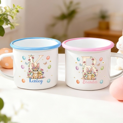 Diseño Floral de Conejito Alfabético : Esta taza esmaltada presenta un adorable conejo con una letra floral, un pollito y huevos de colores, creando un alegre ambiente de Pascua. El divertido conejito y los suaves detalles multicolores aportan un aire primaveral que encantará a los niños. La brillante inicial destaca con claridad, aportando un toque divertido y personal a cada sorbo.