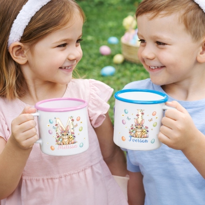 | Estilo | Taza de esmalte de Pascua con nombre personalizado, conejito floral y alfabeto |