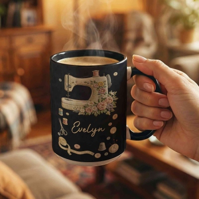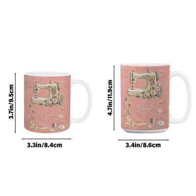 Detalle de nombre personalizado : Un nombre personalizado forma parte del diseño, convirtiendo la taza en un recuerdo personal. Este toque especial celebra el talento y la pasión de quien disfruta de la costura, añadiendo un elemento único que la distingue de las tazas de café comunes.