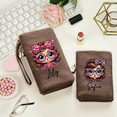 Diseño de leopardo divertido : esta billetera triple presenta una adorable niña de dibujos animados con ojos enormes, gafas elegantes y un atrevido lazo con estampado de leopardo. La vibrante ilustración está impresa en un material suave y delicado, combinando fantasía y modernidad para un look divertido, fresco y lleno de personalidad.