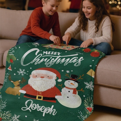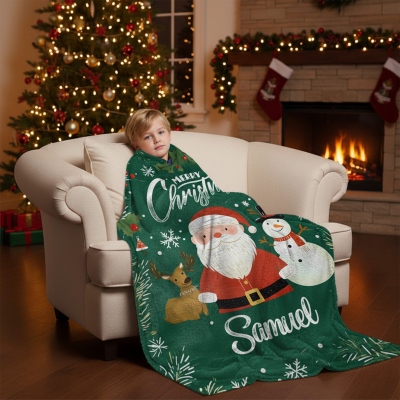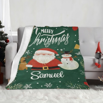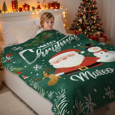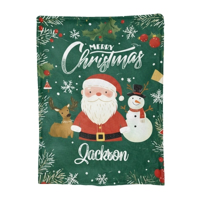 Diseño navideño festivo : Esta manta personalizada de Feliz Navidad presenta un alegre diseño navideño en tonos verdes con Papá Noel, renos, muñecos de nieve, copos de nieve y motivos festivos que iluminan cualquier habitación. Su adorable y colorido diseño transmite alegría navideña, añadiendo calidez y encanto a tu hogar durante la Navidad.