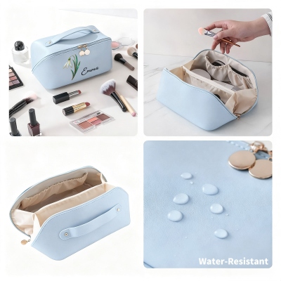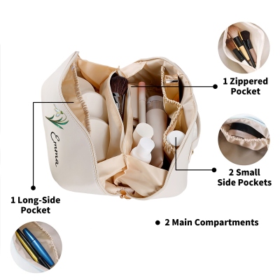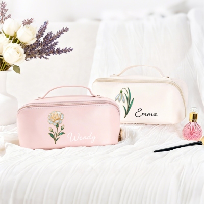 | Estilo | Bolsa de maquillaje de viaje con nombre personalizado y efecto nácar con flor de nacimiento |