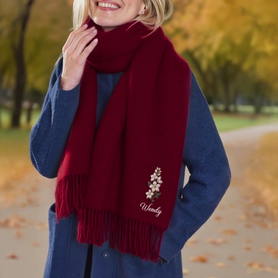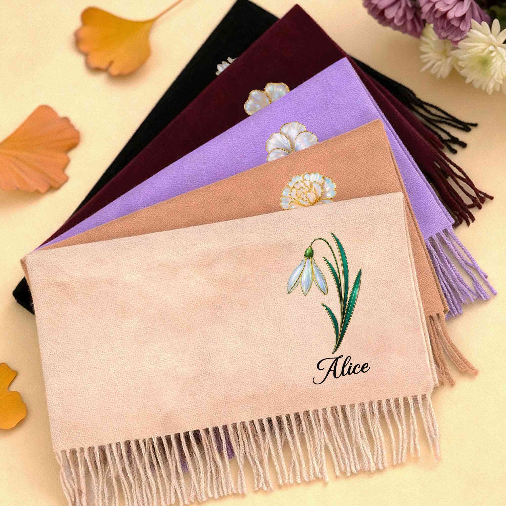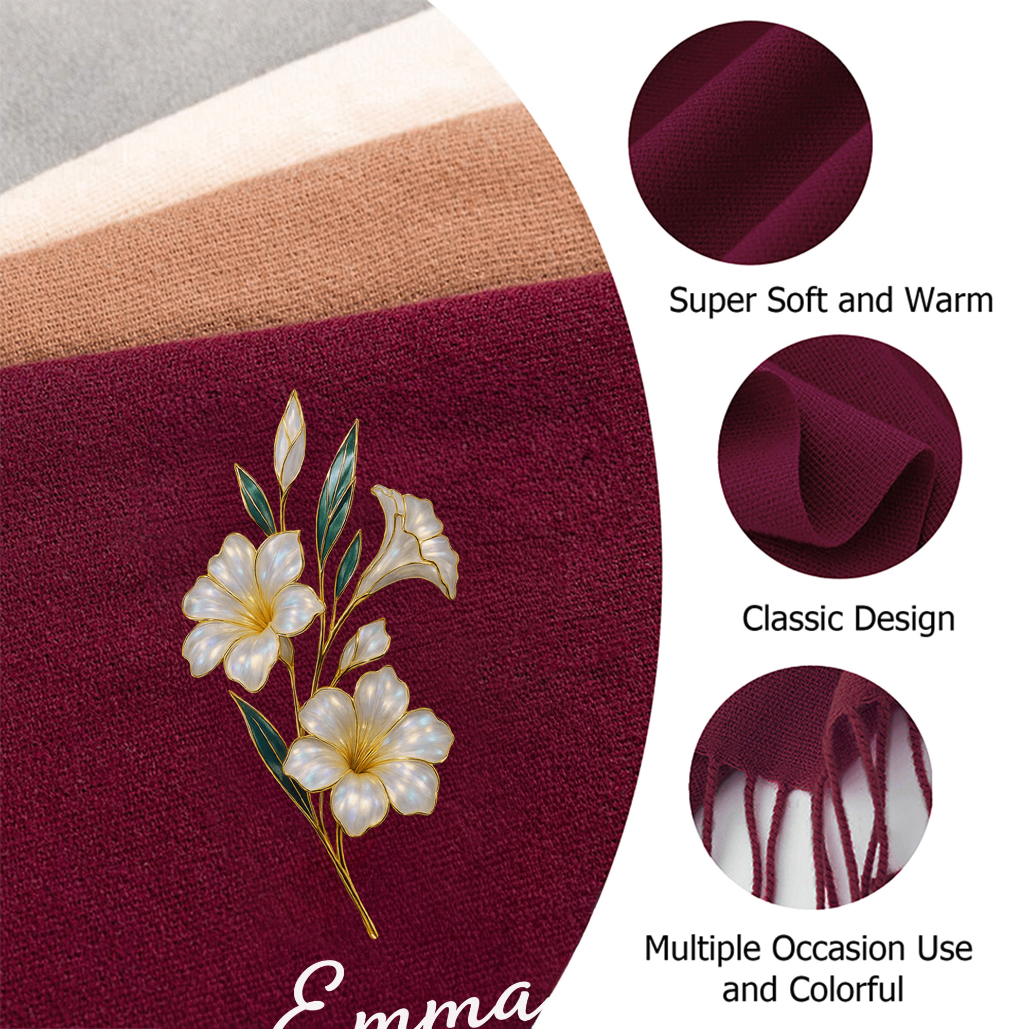 | Estilo | Bufanda de flor de nacimiento con efecto nácar y nombre personalizado con borla |