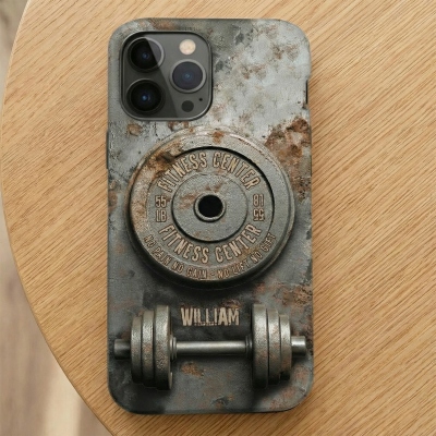 Estuche rústico para teléfono Fitness : un estuche resistente de TPU para teléfono que presenta un diseño desgastado de placa y barra de pesas, que captura el espíritu crudo del gimnasio con audaces detalles industriales.