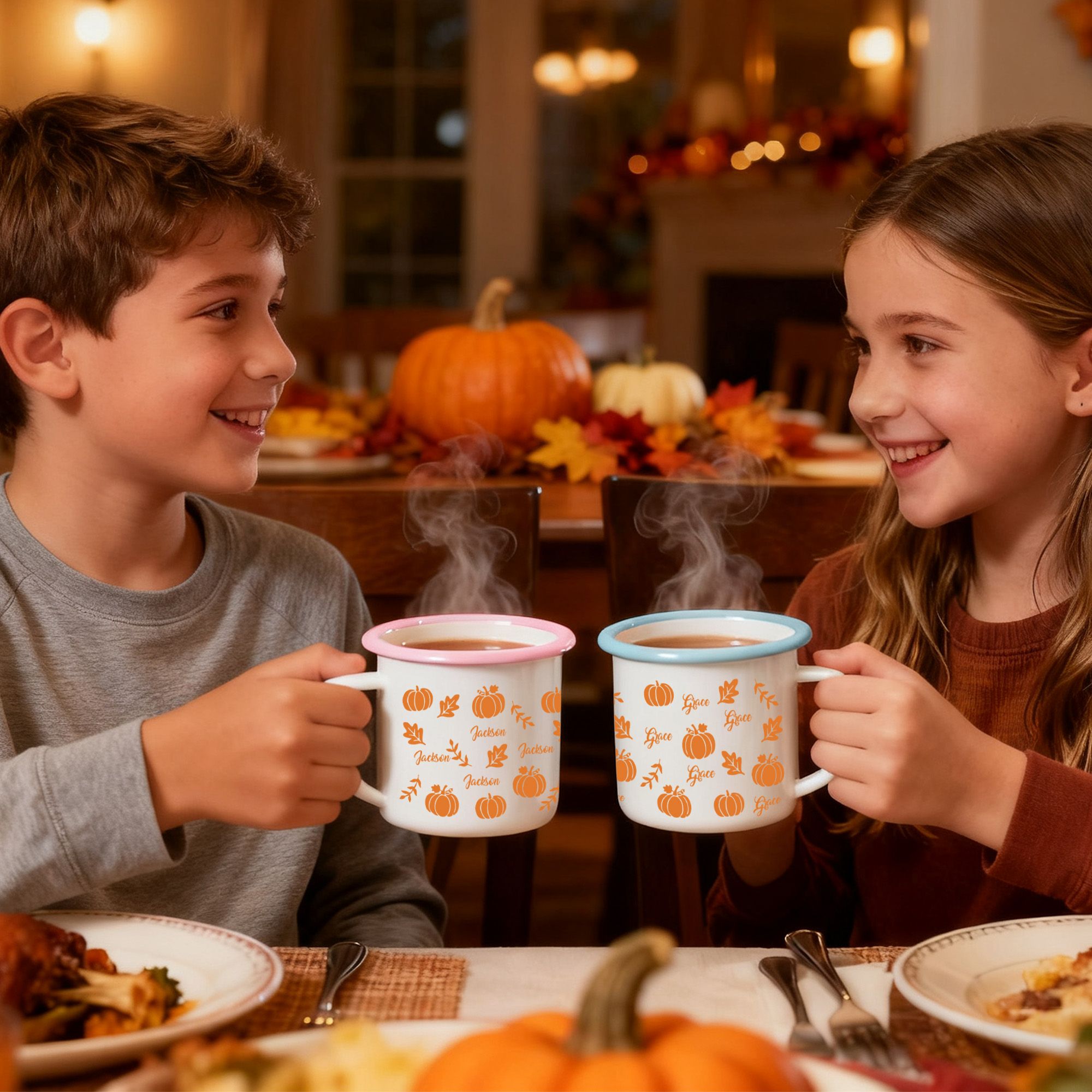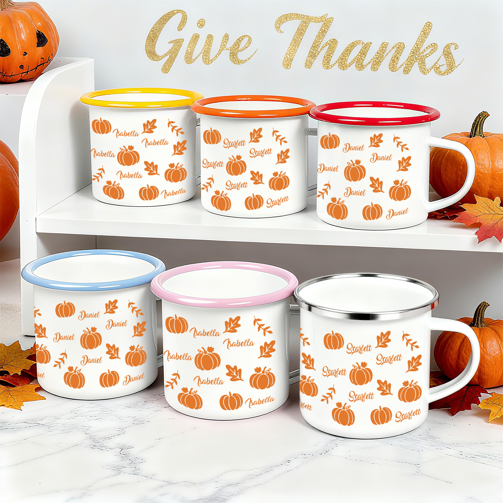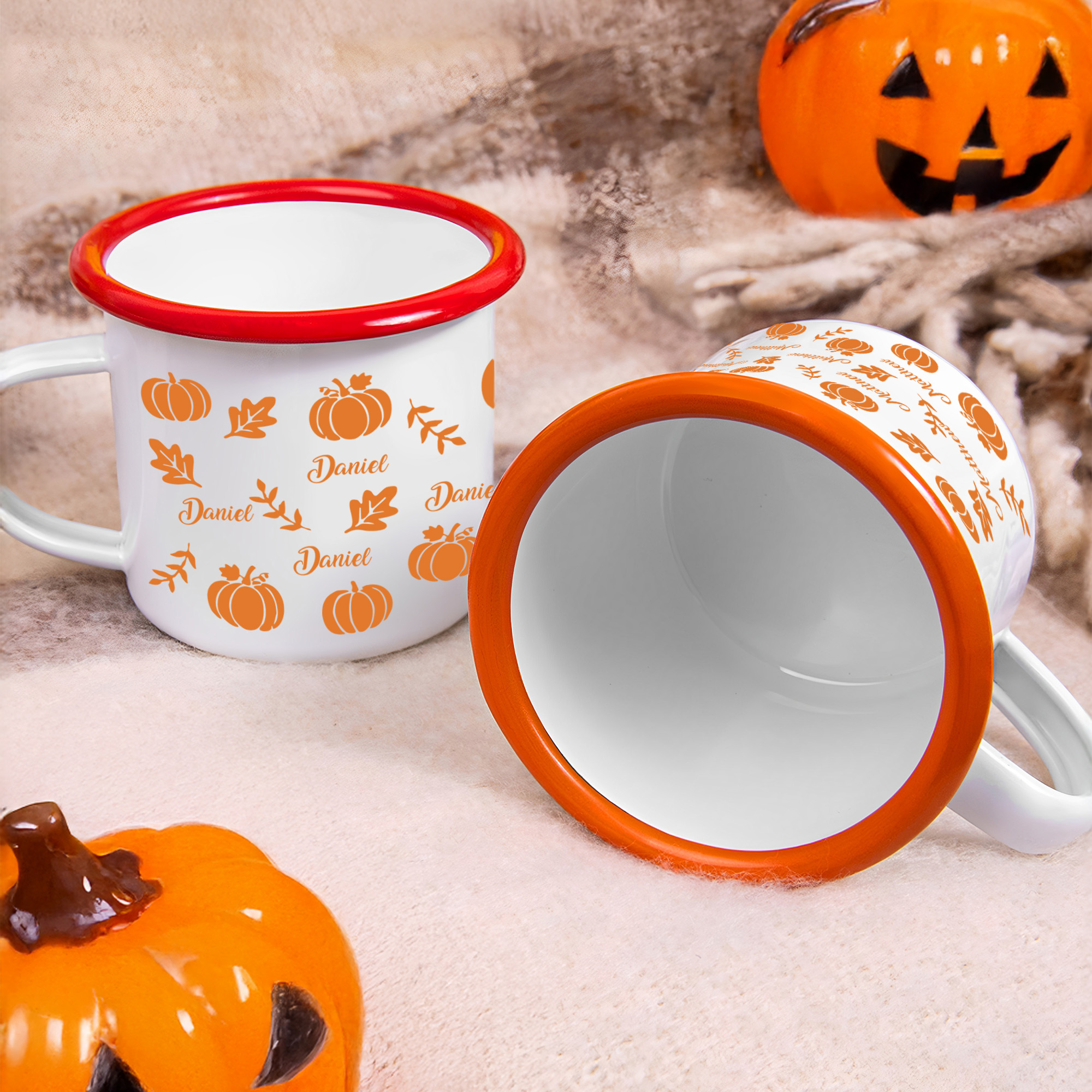 | Estilo | Taza de esmalte con nombre personalizado, calabaza y hoja de arce |