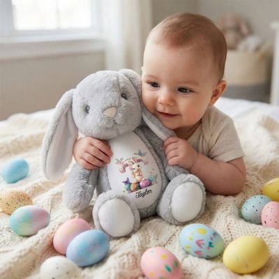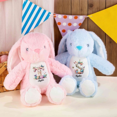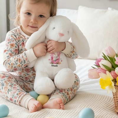 Toque personalizado : el conejito se personaliza con el nombre y la inicial de un niño, lo que convierte al juguete de peluche en un recuerdo único que celebra la identidad y agrega un toque personal a la Pascua de un niño.