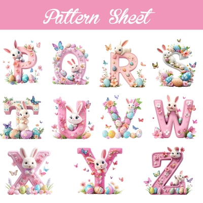 Diseño de alfabeto de conejito : este conejo de peluche con orejas esponjosas presenta una letra del alfabeto rosa suave con un lindo conejito, huevos de Pascua coloridos y acentos florales, creando una apariencia de letra 3D divertida que se siente cálida, alegre y perfecta para la decoración o los abrazos de primavera.
