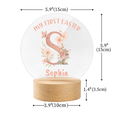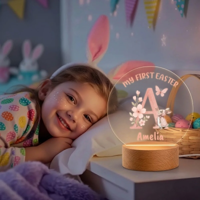 Acrílico transparente con base de madera : Fabricada en acrílico suave y con una base de madera natural, esta luz nocturna ofrece un acabado limpio y moderno. La superficie transparente resalta el adorable conejo y los elementos inspirados en la Pascua, mientras que la luz LED es suave para los ojos de los niños.