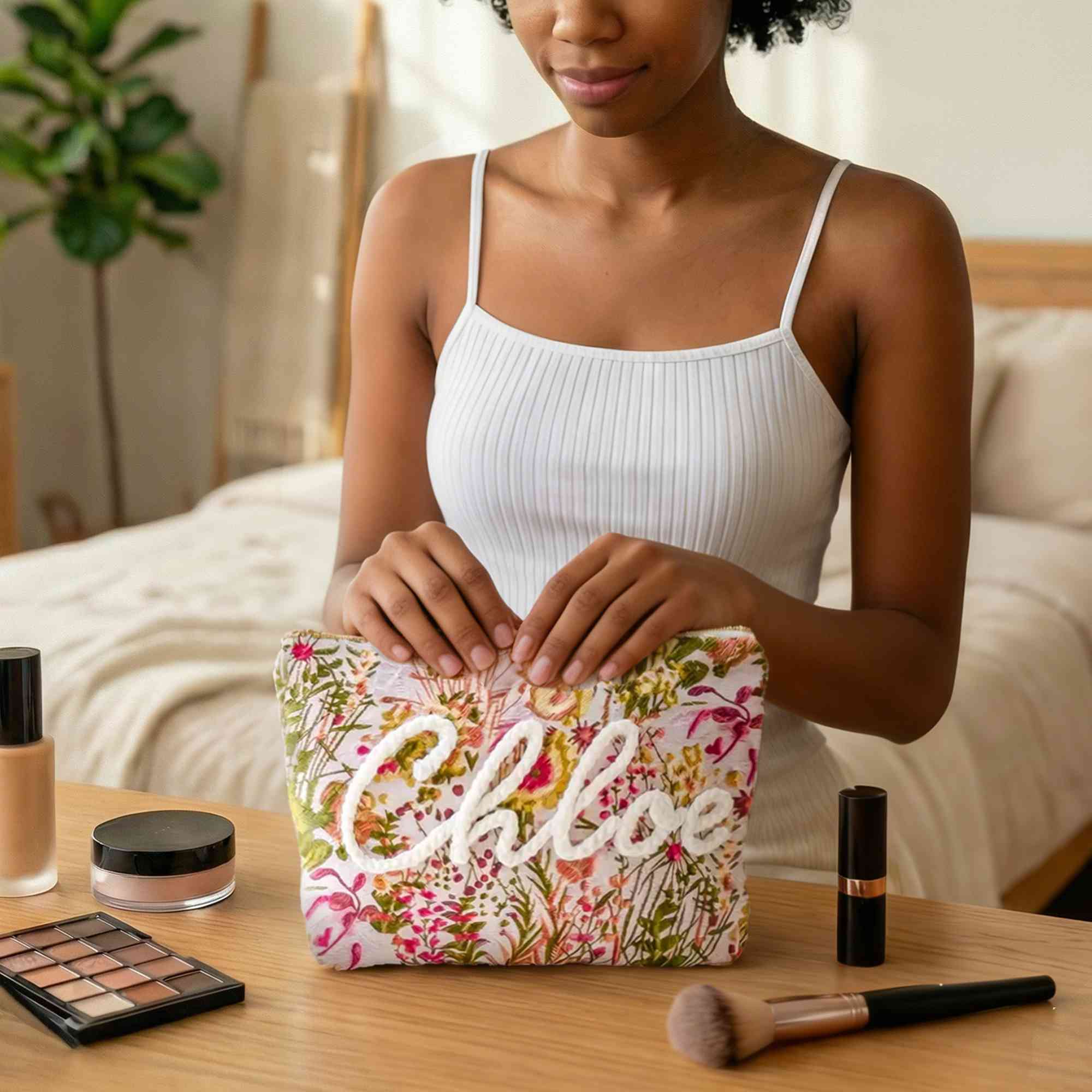 Un gran sentimiento : más que un simple lugar para guardar cosas, es un delicado recordatorio de que uno se siente visto: se puede colocar junto al tocador al amanecer, guardar en el equipaje de mano para viajes de fin de semana o abrir para revelar no solo cosméticos, sino el amor tejido en cada lazo y pétalo.