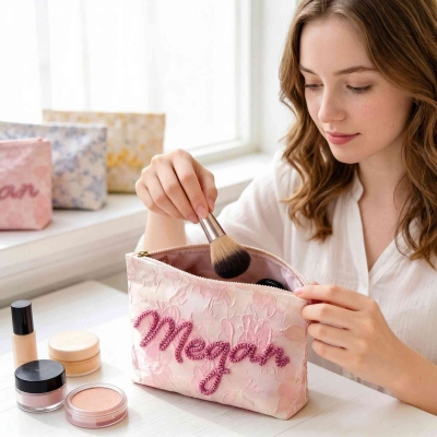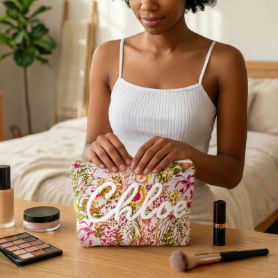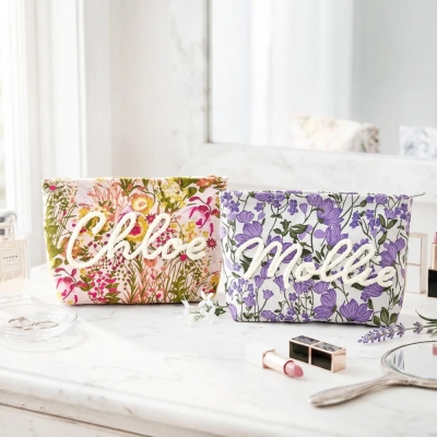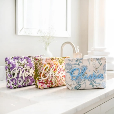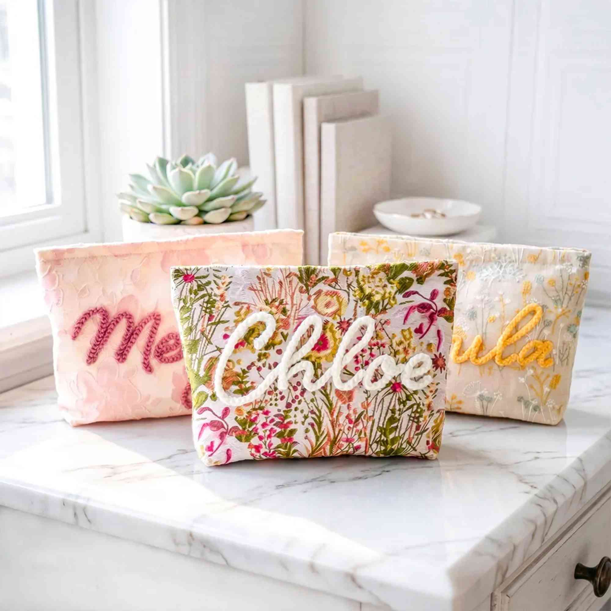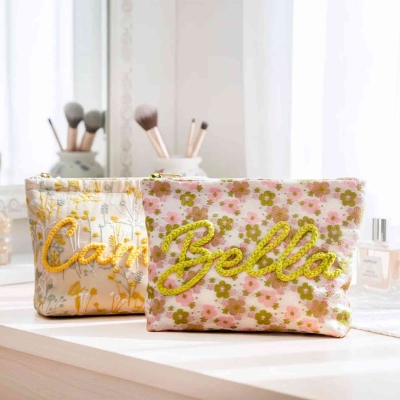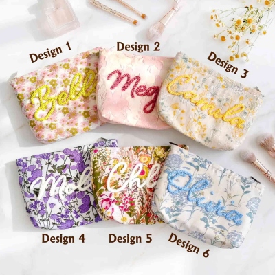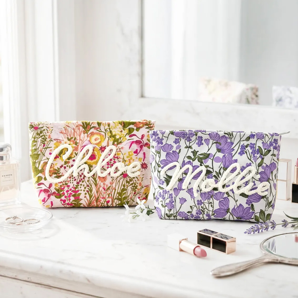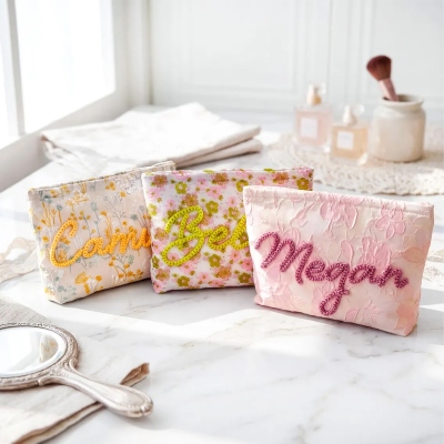 Diseño floral vintage : cada bolsita presenta una base suave y texturizada en delicado jacquard floral o algodón bordado, con el nombre del destinatario cosido en hilo en relieve para un acabado táctil de calidad excepcional.