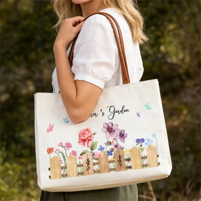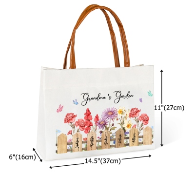 Diseño "Jardín de la Abuela" : Este bolso tote presenta un encantador diseño "Jardín de la Abuela" lleno de hermosas flores de nacimiento, cada una representando a un hijo o nieto querido. El delicado arreglo floral crea un ambiente cálido y emotivo, convirtiendo un sencillo bolso de diario en un dulce recuerdo de la familia. Su suave estilo botánico combina a la perfección con atuendos casuales y celebra el amor que nace en la familia.