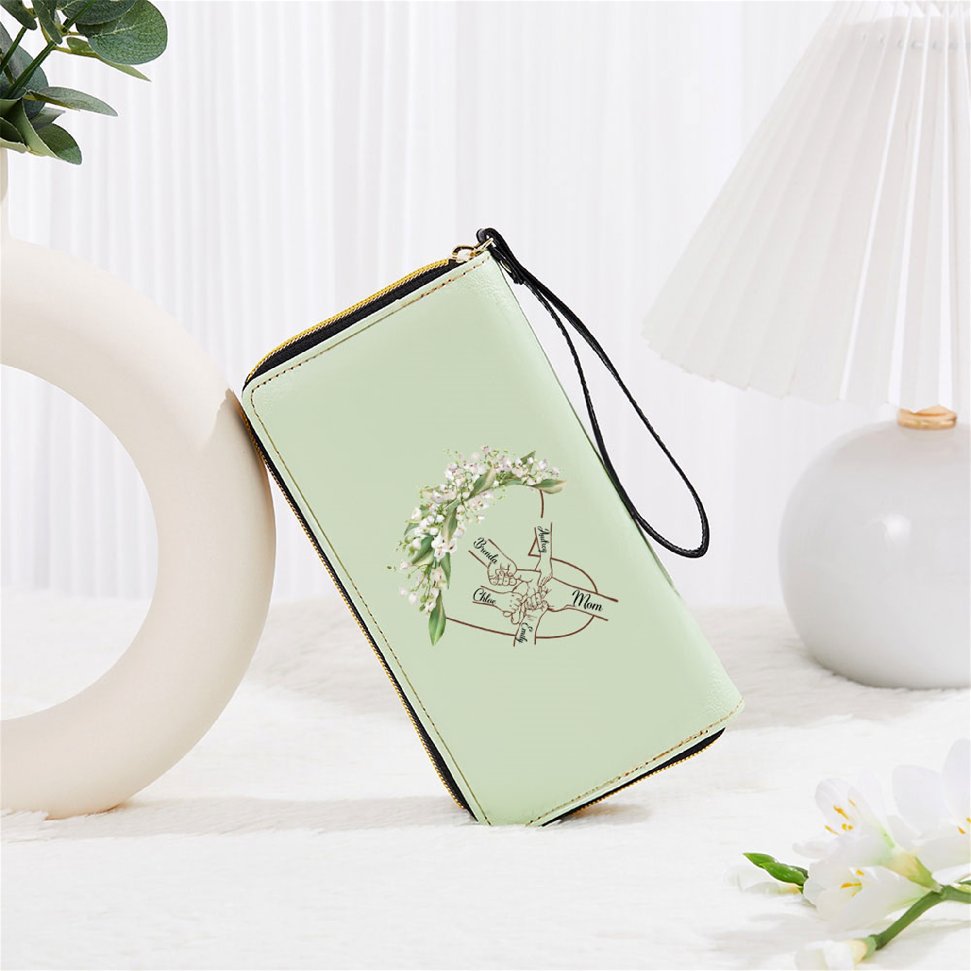 Toque personalizado : Cada billetera se puede personalizar con una flor de nacimiento y nombres para representar a la mamá y a los miembros de la familia. Los detalles cuidados convierten esta billetera en un recuerdo único, creado especialmente para mamá, abuela o una nueva mamá que celebra el crecimiento de su familia.