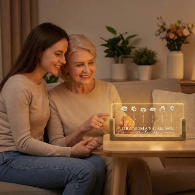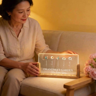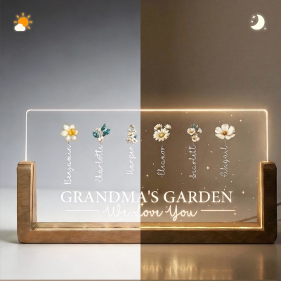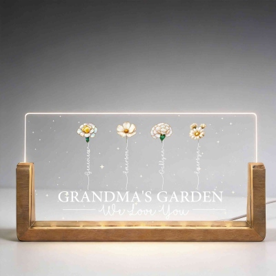 Diseño Jardín Floreciente : Esta lámpara de noche LED rectangular presenta un encantador diseño inspirado en el Jardín de la Abuela, donde cada hijo o nieto está representado por su flor de nacimiento. Las flores crecen juntas en un mismo jardín, simbolizando el amor, el crecimiento y la unión familiar. Su diseño sencillo y su luz cálida crean una delicada pieza decorativa que queda preciosa en una mesita de noche, una estantería o un escritorio.