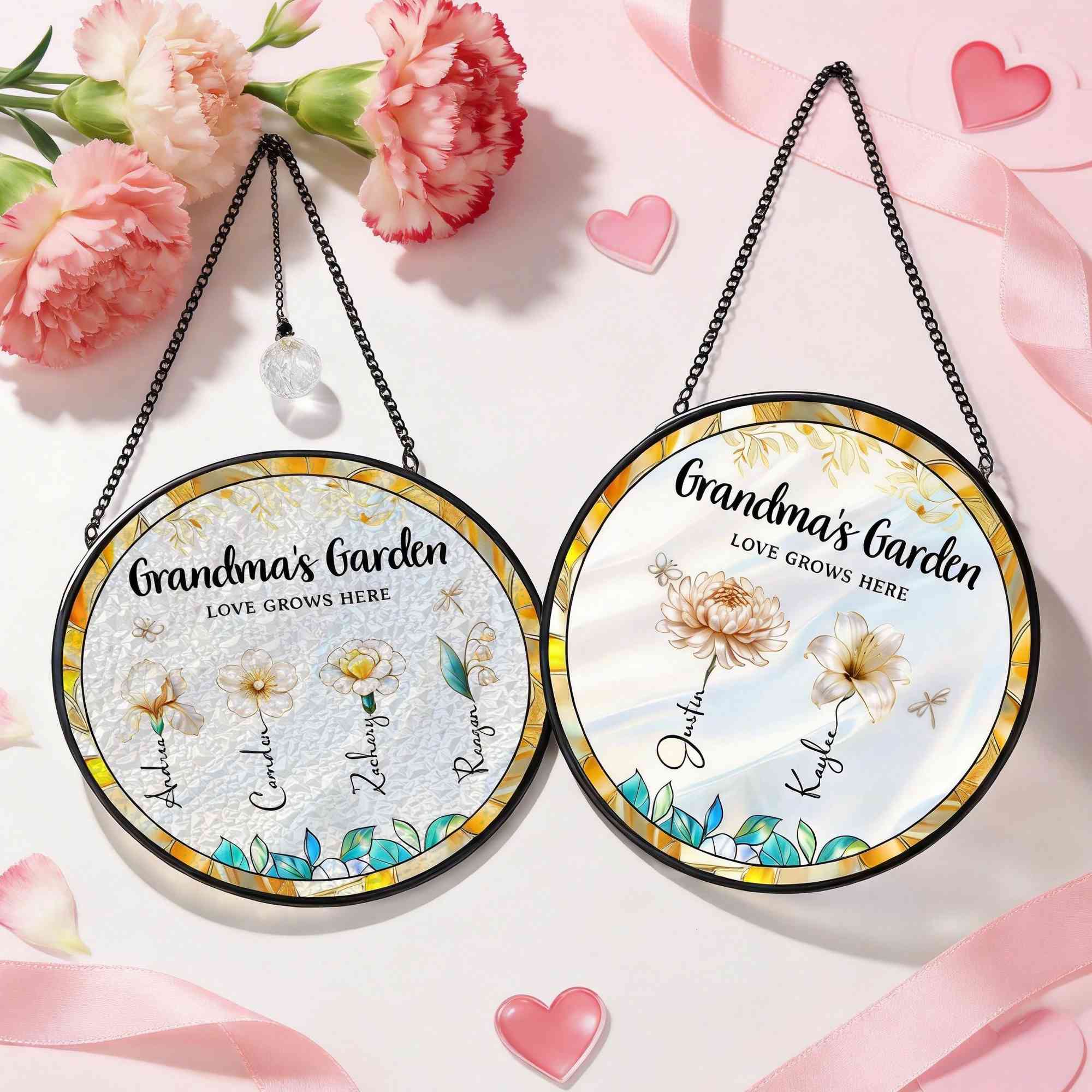 | Estilo | Nombres personalizados y flores de nacimiento. Atrapasueños de vidrieras del jardín de la abuela. |