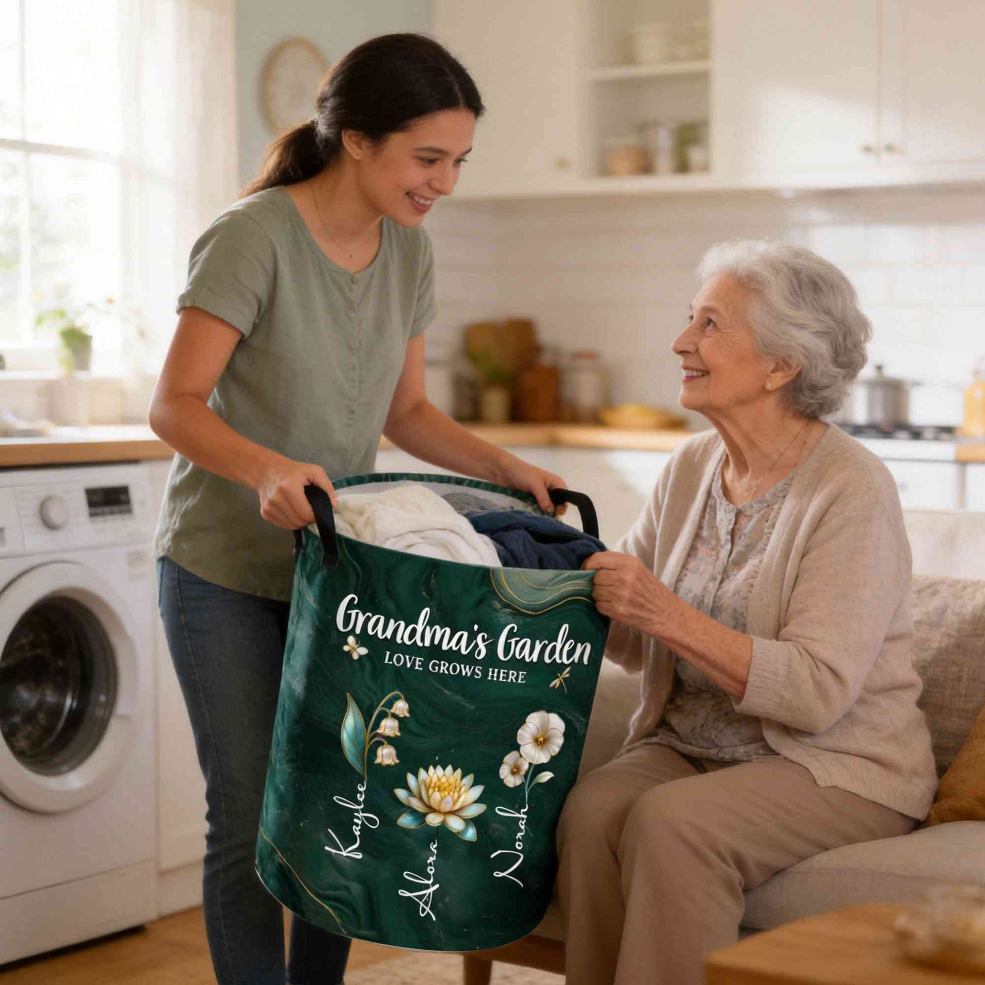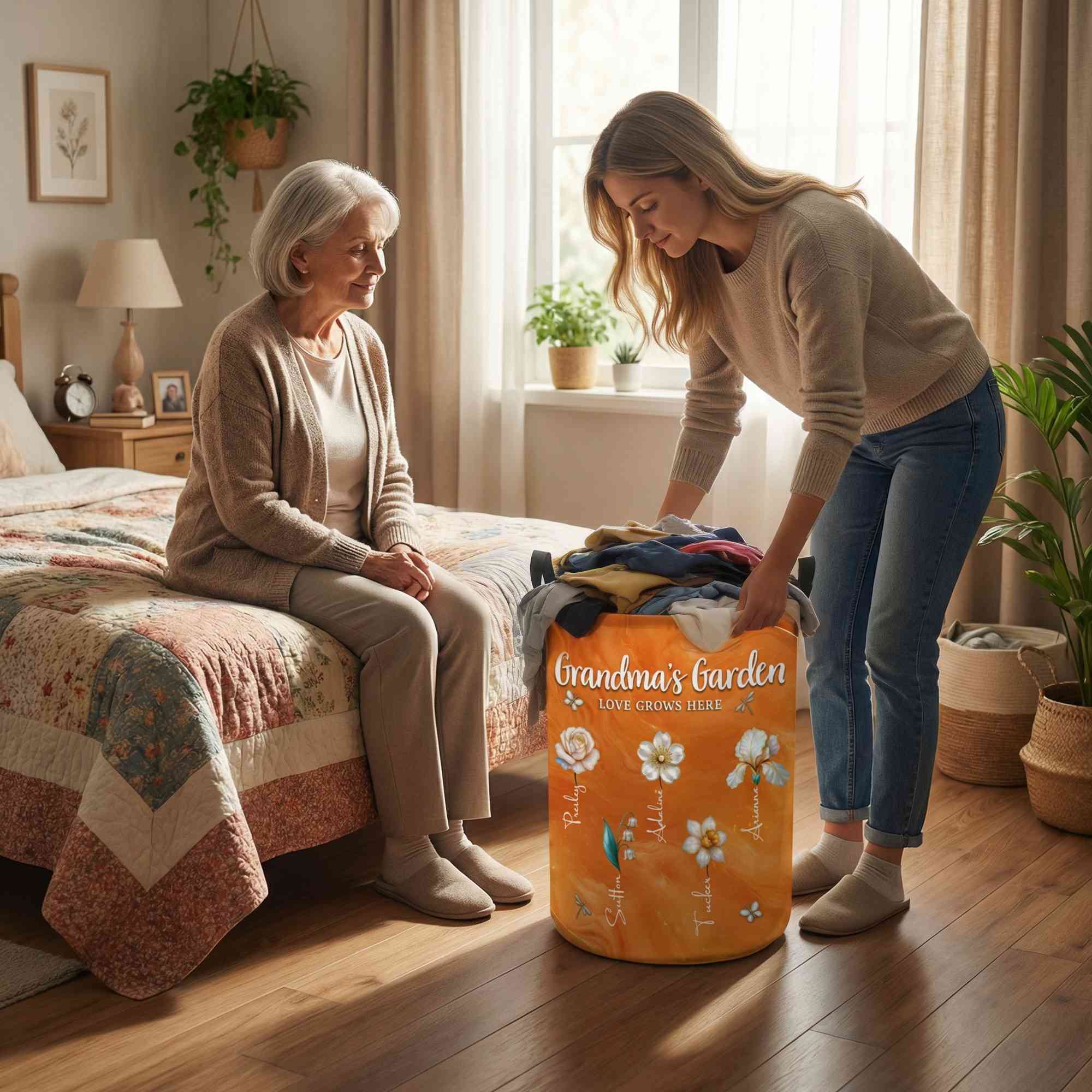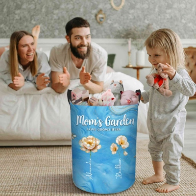 Diseño de Jardín de la Abuela : Esta cesta de almacenamiento presenta una encantadora temática de jardín con nombres personalizados y flores de nacimiento a juego. Cada flor representa a un ser querido, creando un jardín cálido y lleno de significado para la abuela o la mamá. El delicado diseño floral y la disposición sobria se adaptan a estilos de hogar modernos, rústicos o acogedores.