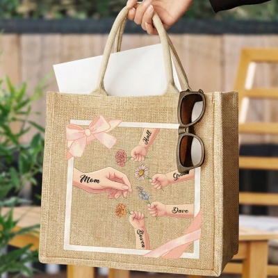 Conmovedor diseño familiar : Este bolso de mano presenta una tierna ilustración de una madre o abuela con las manos de sus hijos, acompañada de delicadas flores de nacimiento, nombres y un lazo. Su encantador diseño celebra el vínculo especial entre una madre o abuela y sus hijos o nietos, dándole un toque cálido y significativo.