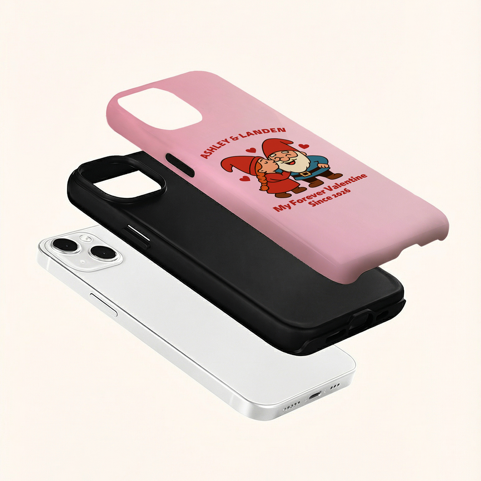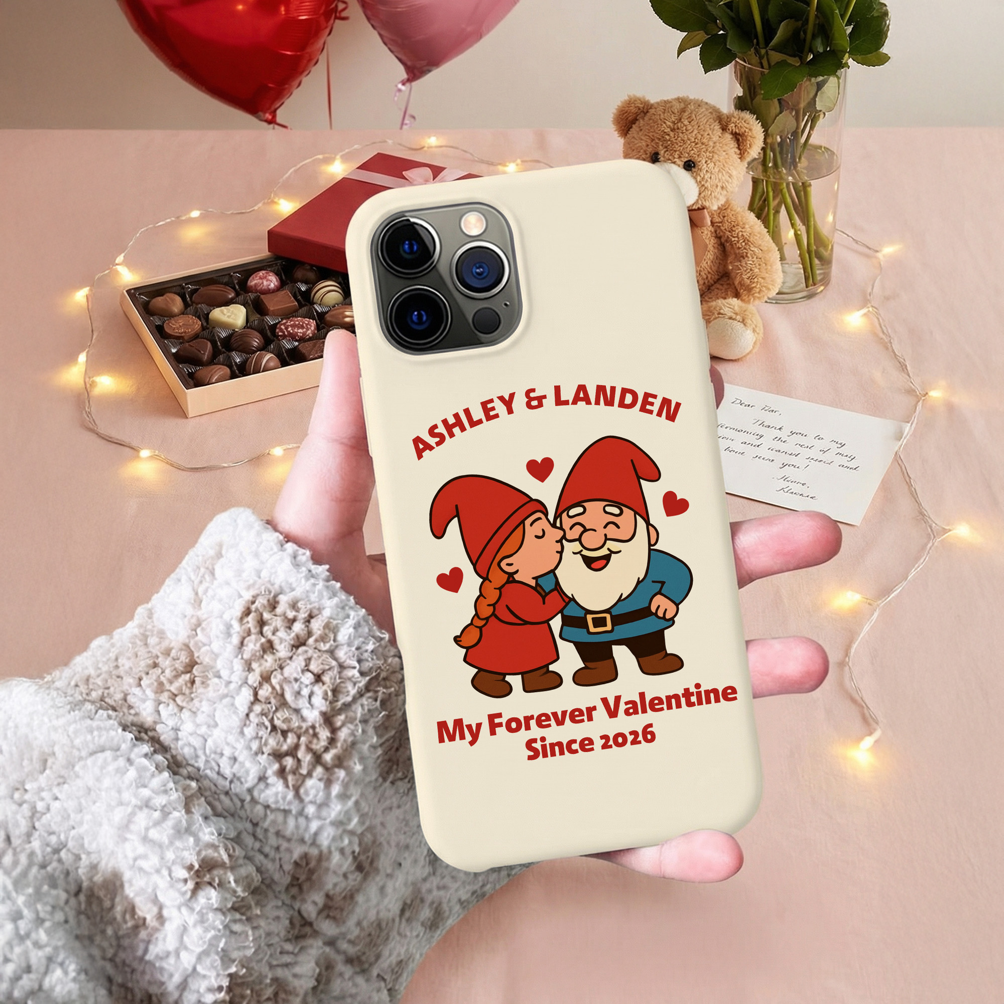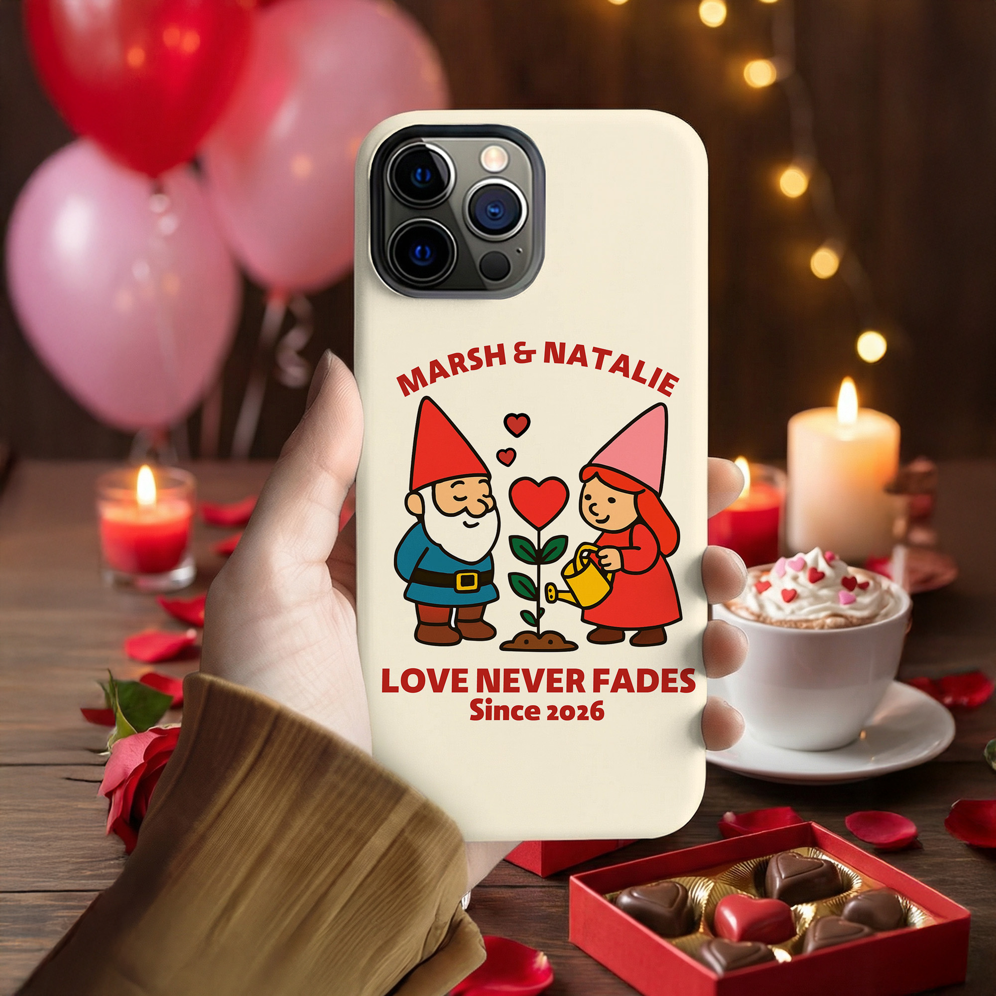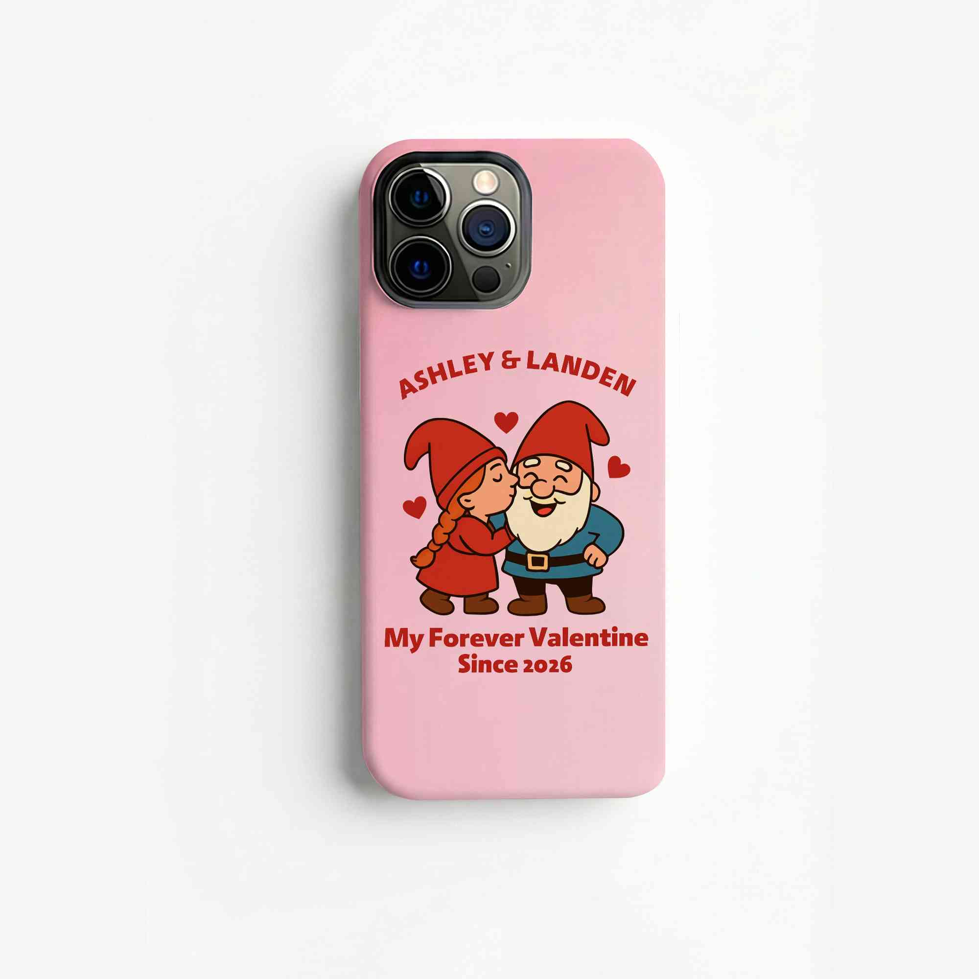 Diseño de Pareja de Enanos Caricatura : Esta funda para teléfono presenta una encantadora pareja de gnomos con corazones y rosas, que simbolizan el amor, la lealtad y los recuerdos compartidos. Su divertido estilo de caricatura aporta calidez y personalidad, a la vez que mantiene un aspecto limpio y moderno para el día a día.