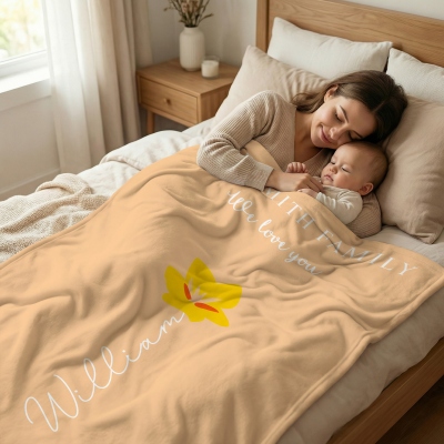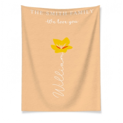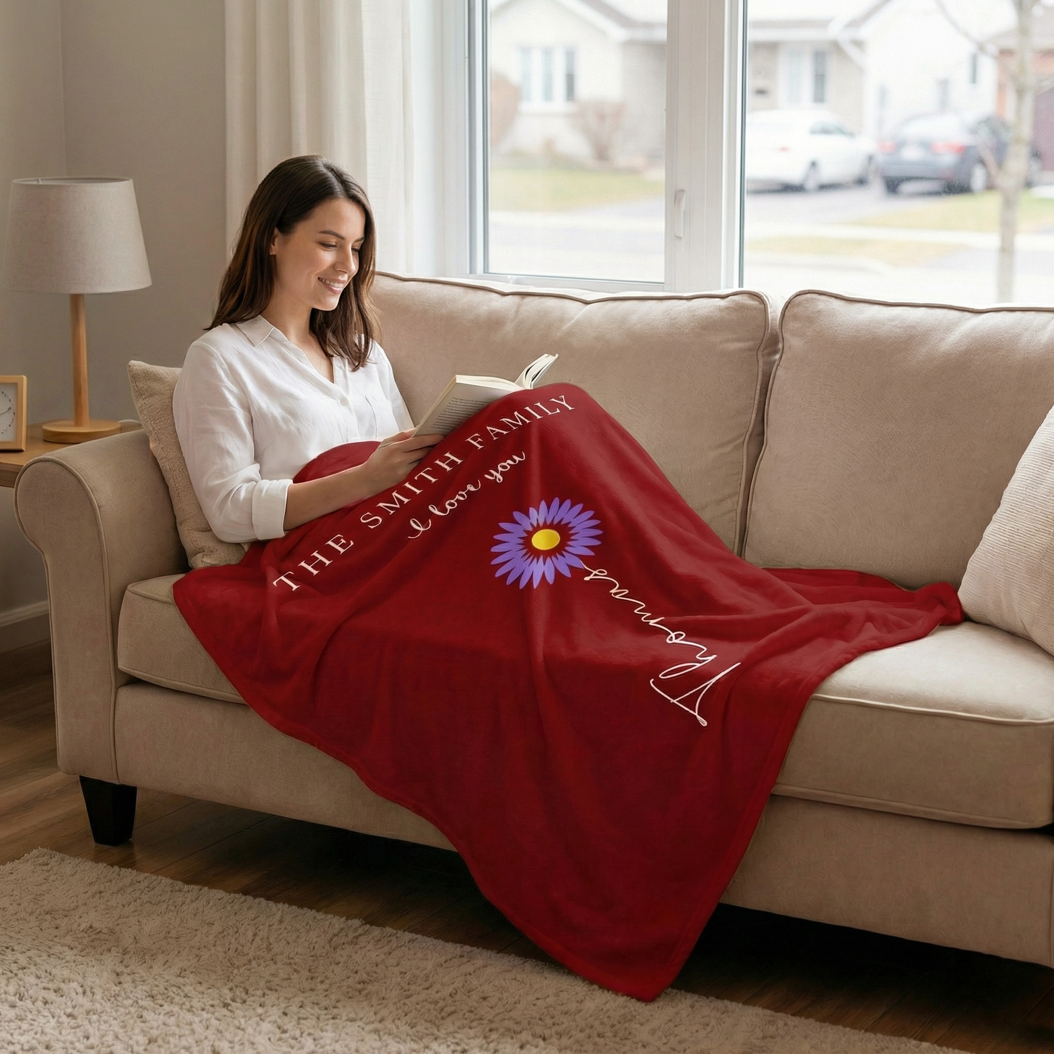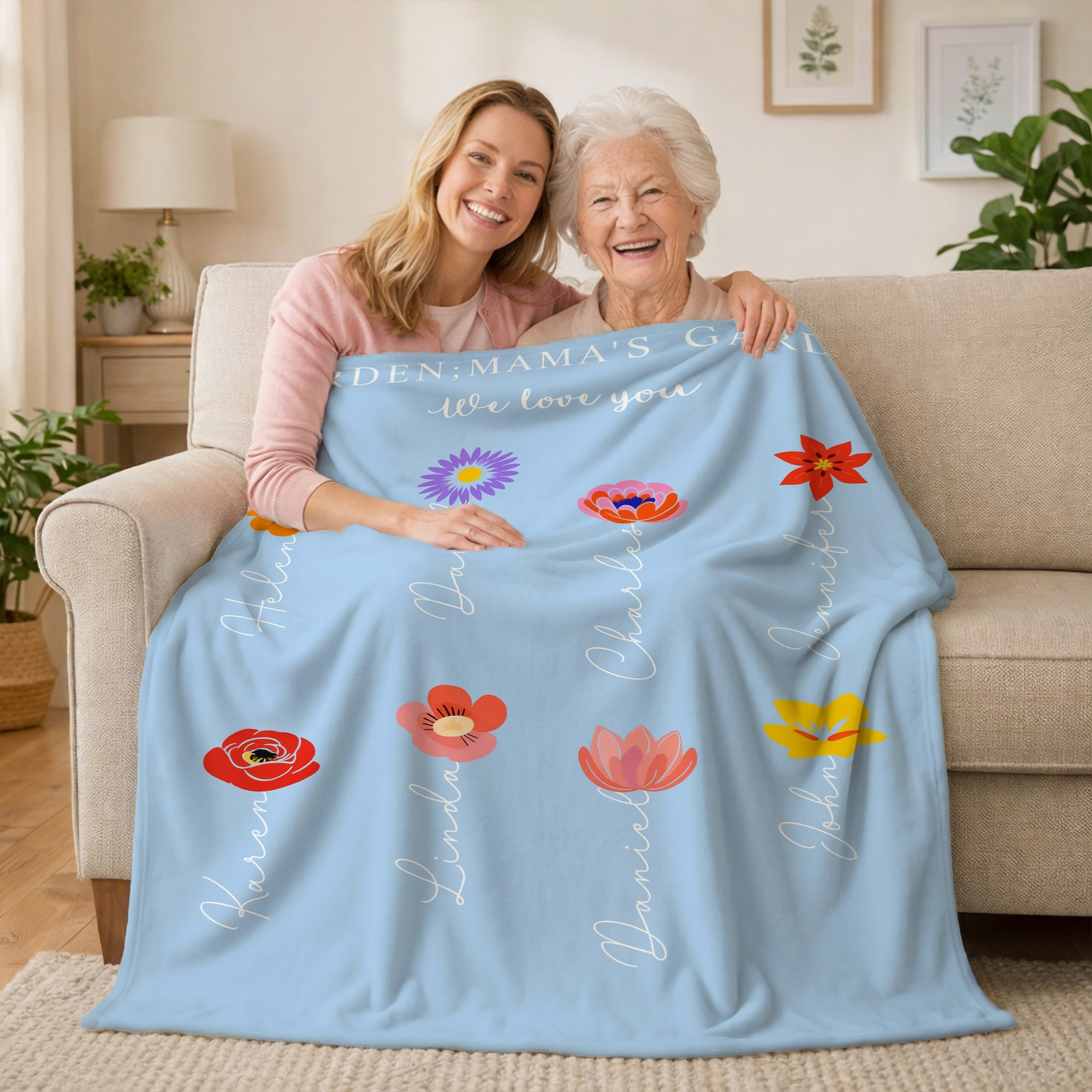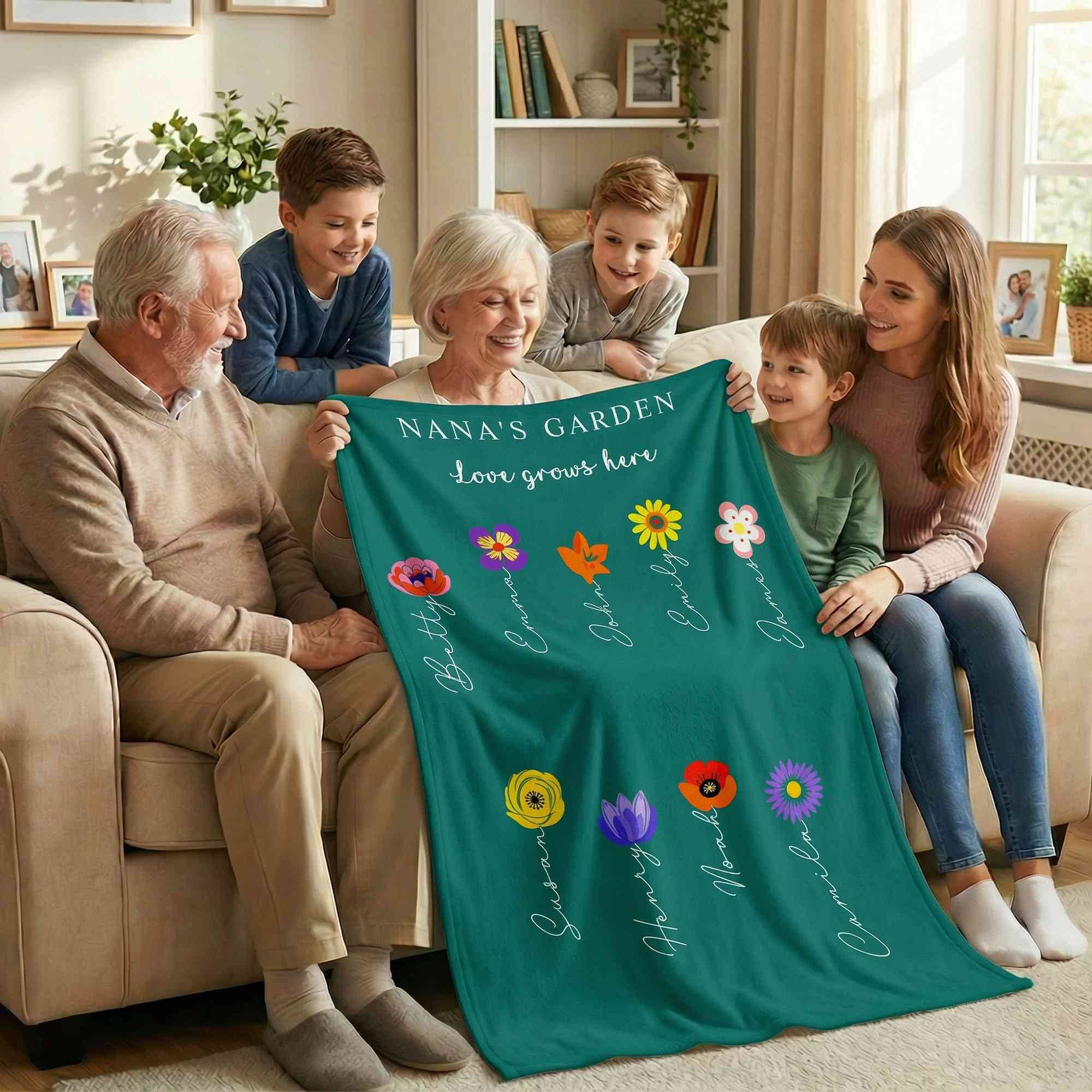 Diseño Jardín del Amor : Esta manta presenta un vibrante tema de "jardín de la abuela" con coloridas flores de nacimiento dispuestas como un jardín familiar en plena floración. Cada flor representa a un ser querido, creando una cálida y significativa composición que refleja la conexión y el crecimiento familiar en un estilo suave y multicolor.