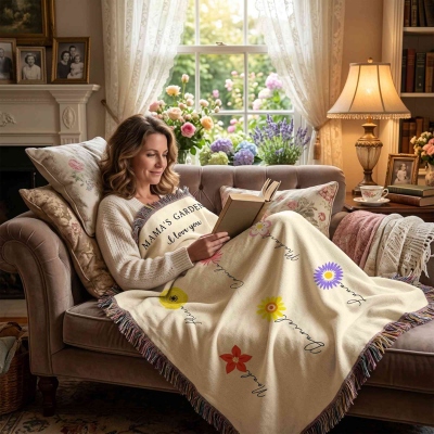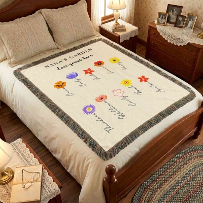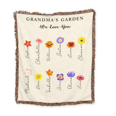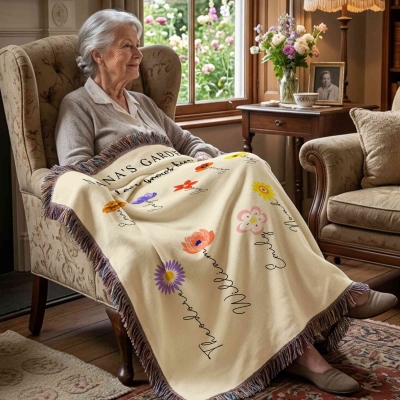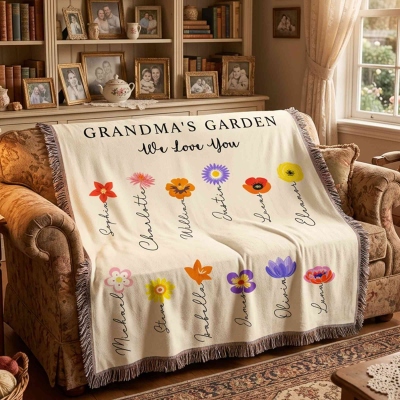 Nombres personalizados y flores de nacimiento : Cada flor se puede combinar con un nombre personalizado y su mes de nacimiento correspondiente, creando una manta verdaderamente única. El diseño sencillo resalta cada nombre y destaca el lugar de cada miembro de la familia en el jardín.