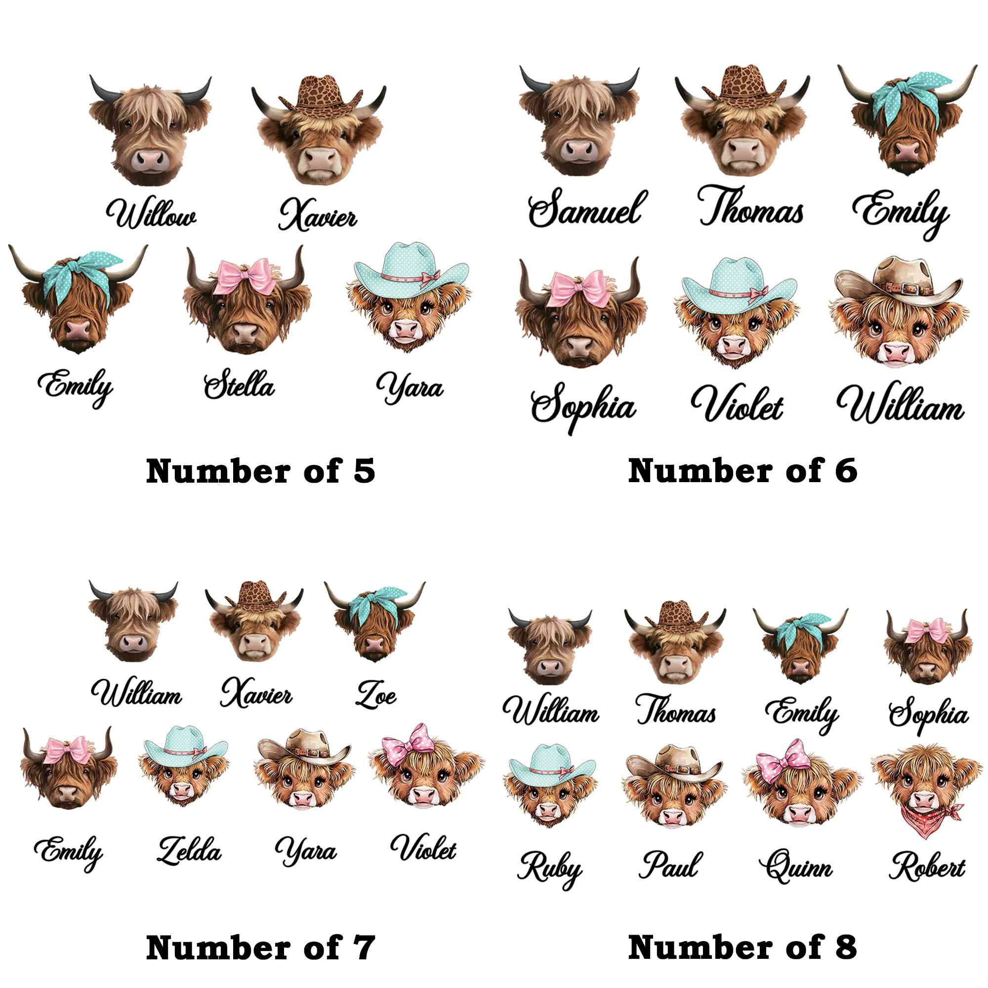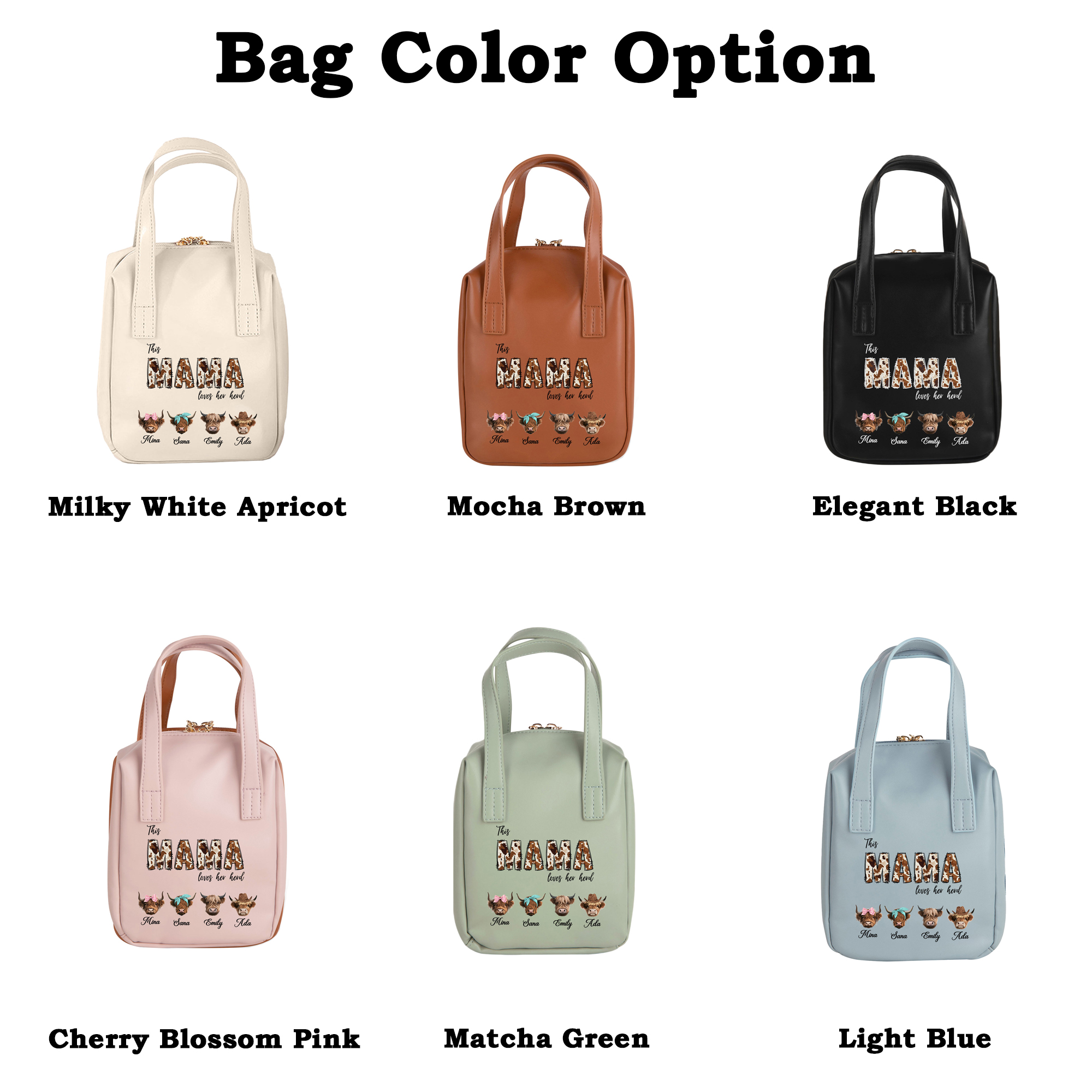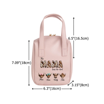 Diseño Familiar de Vacas de las Tierras Altas : Este neceser presenta una encantadora temática de vacas de las Tierras Altas que celebra el amor entre la abuela/mamá y su rebaño. La tierna ilustración, combinada con los nombres de la familia, crea un diseño conmovedor que refleja calidez, cercanía y orgullo familiar. La obra de arte de inspiración occidental aporta un toque rústico y acogedor que destaca en los accesorios de diario.