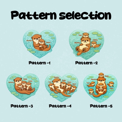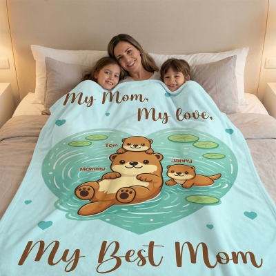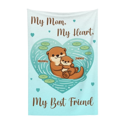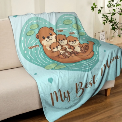 | Estilo | Manta familiar personalizada con forma de corazón, con diseño de mamá nutria y bebé, y nombre. |
