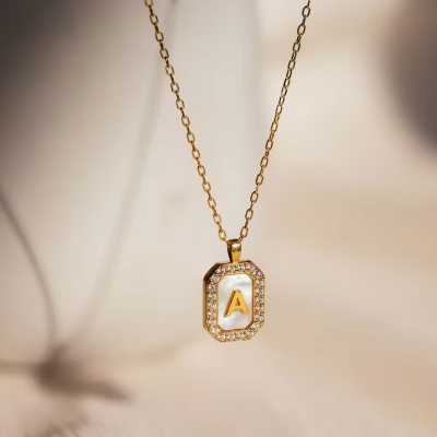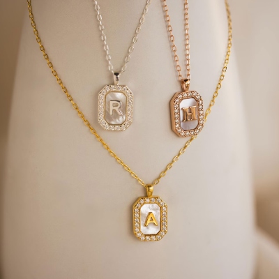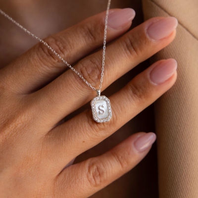 Diseño inicial en pavé y perla : Este elegante collar presenta un colgante rectangular con un centro de nácar liso y una inicial llamativa. Toda la montura está incrustada con brillantes circonitas cúbicas en un engaste pavé, creando un contraste deslumbrante entre un brillo suave y un brillo radiante.