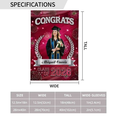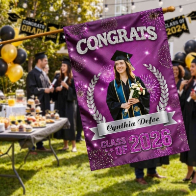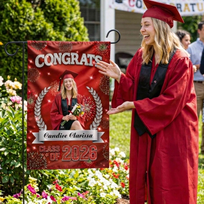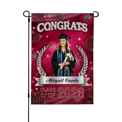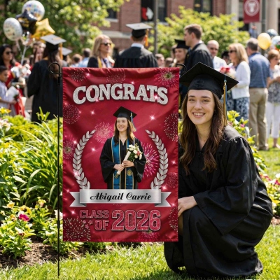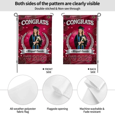Diseño para la Celebración de Graduación : Esta bandera de jardín resalta un tema festivo para la graduación de la Clase de 2026, combinando un diseño limpio con detalles multicolores. El espacio para fotos y la tipografía llamativa crean una decoración cálida y memorable para el jardín que destaca durante la temporada de graduaciones.