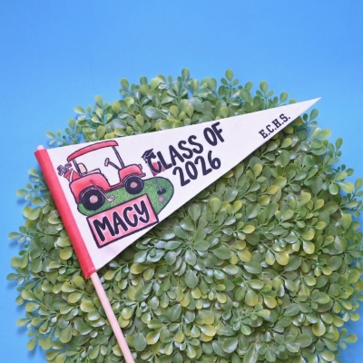 Banderín de Graduación : Este alegre banderín de fieltro presenta un diseño divertido con motivos deportivos, como béisbol, fútbol o golf, junto con las palabras "Clase de 2026". Sus colores brillantes y gráficos alegres lo hacen perfecto para celebrar la trayectoria de un estudiante de último año y su pasión por su deporte favorito.
