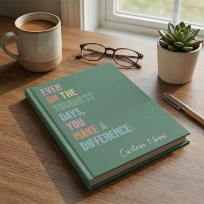 Diario de afirmaciones : Este cuaderno de tapa dura tamaño A5 presenta una relajante cubierta verde con palabras inspiradoras: «Incluso en los días más difíciles, tú marcas la diferencia». Las letras coloridas y el diseño delicado invitan a la reflexión, la gratitud y la fortaleza interior.