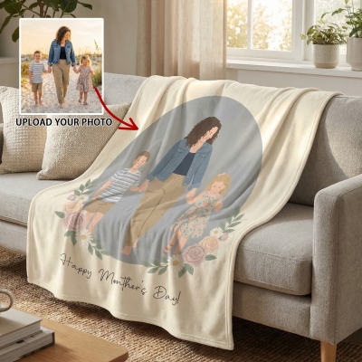 Sube tu foto personalizada : añade tu propia foto para crear un recuerdo único. La imagen personalizada se transforma en un precioso retrato dibujado a mano, enmarcado por una corona floral y centrado sobre una manta acogedora.