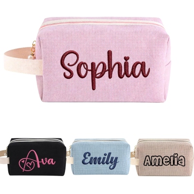 Bolsa de maquillaje de pana con nombre bordado personalizado, bolsa de cosméticos portátil con asa, esencial de viaje, regalo de cumpleaños o día de la madre para ella, mamá o amigas.